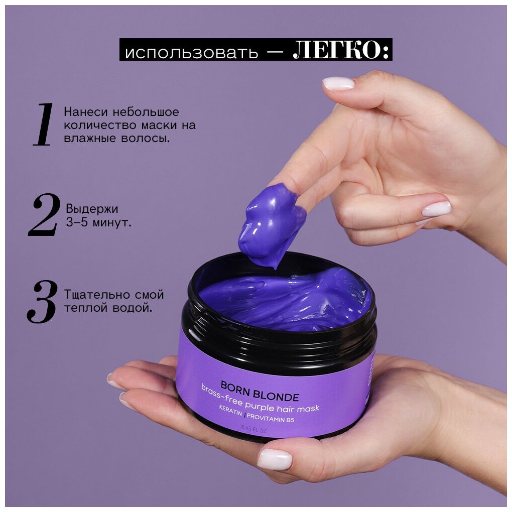 Если блонд - то по твоим правилам! Забудь про нежелательную желтизну и необходимость частого тонирования в салоне с фиолетовой маской Born Blonde от Beautific. Ее тонирующая формула с фиолетовым пигментом разработана для эффективного сохранения холодных оттенков блонда и нейтрализации желтизны. Кератин в сочетании с аргановым маслом и маслом ши восстанавливает повреждения, вызванные окрашиванием, уменьшает пористость волос, а также интенсивно питает и увлажняет их.