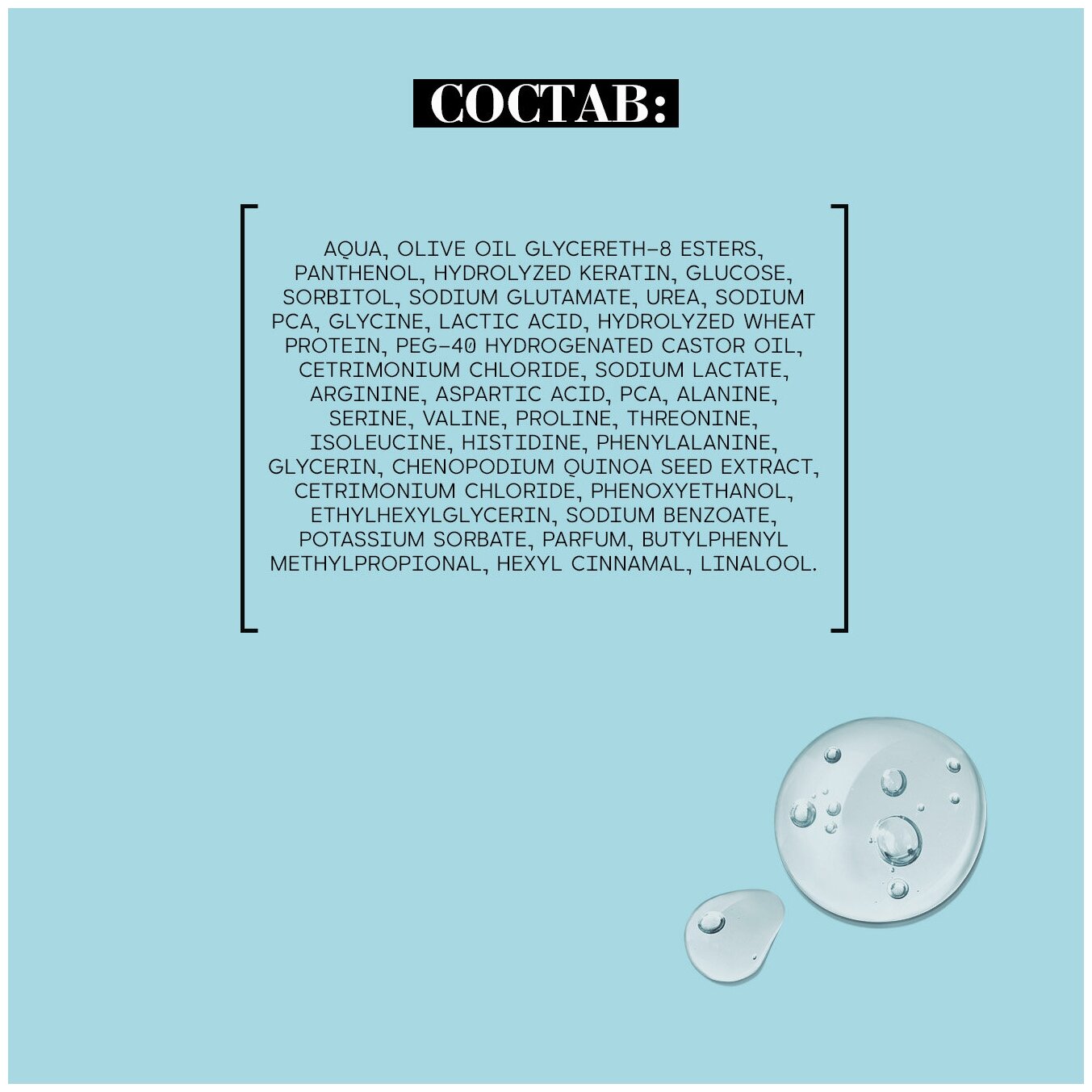 Состав: aqua, olive oil glycereth-8 esters, panthenol, hydrolyzed keratin, glucose, sorbitol, sodium glutamate, urea, sodium pca, glycine, lactic acid, hydrolyzed wheat protein, peg-40 hydrogenated castor oil, cetrimonium chloride, sodium lactate, arginine, aspartic acid, pca, alanine, serine, valine, proline, threonine, isoleucine, histidine, phenylalanine, glycerin, chenopodium quinoa seed extract, phenoxyethanol, ethylhexylglycerin, sodium benzoate, potassium sorbate, parfum, butylphenyl methylpropional, hexyl cinnamal, linalool.