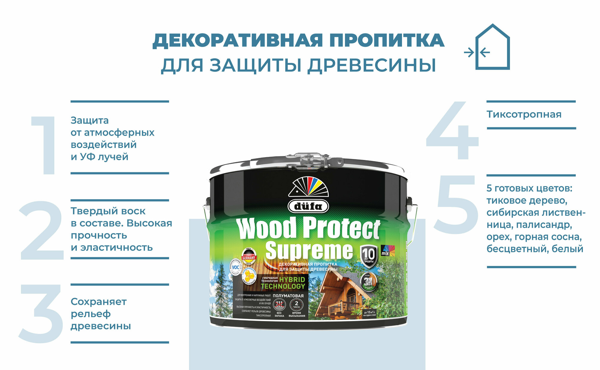 Технология Hybrid (гарантирует: глубокое проникновение и высокую прочность эмульсии алкида и быстрое высыхание, эластичность, долговечность и высокую экологичность акрилатной дисперсии);Твердый воск в составе способствует улучшенным водоотталкивающим свойствам пропитки, образует гидрофобное покрытие. Формула 3 в 1 объединяет в одном продукте грунтовку (равномерное впитывание), защиту древесины (от УФ воздействий, плесени и синевы) и декоративный эффект (полуматовое покрытие, приятное на ощупь); До 10 лет защиты древесины.