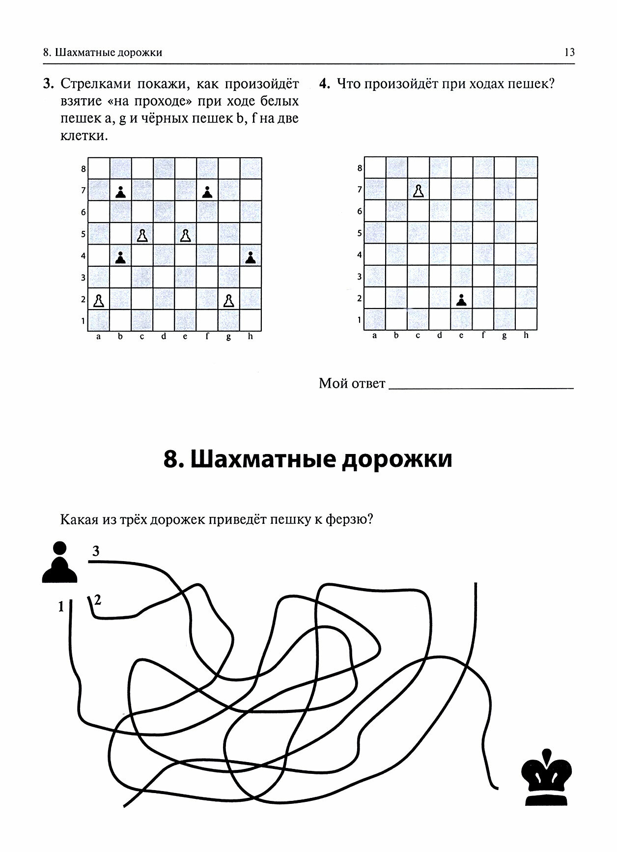 Эта рабочая тетрадь предназначена для детей, которые начали изучать шахматы. В ней даны шахматные задачи с ответами по всем темам базового курса, благодаря которым можно на практике закрепить теоретические знания. А чтобы поддержать интерес ребёнка и развить его мышление, мы включили в книгу множество увлекательных заданий на шахматные темы - от ребусов и судоку до викторин и кроссвордов.