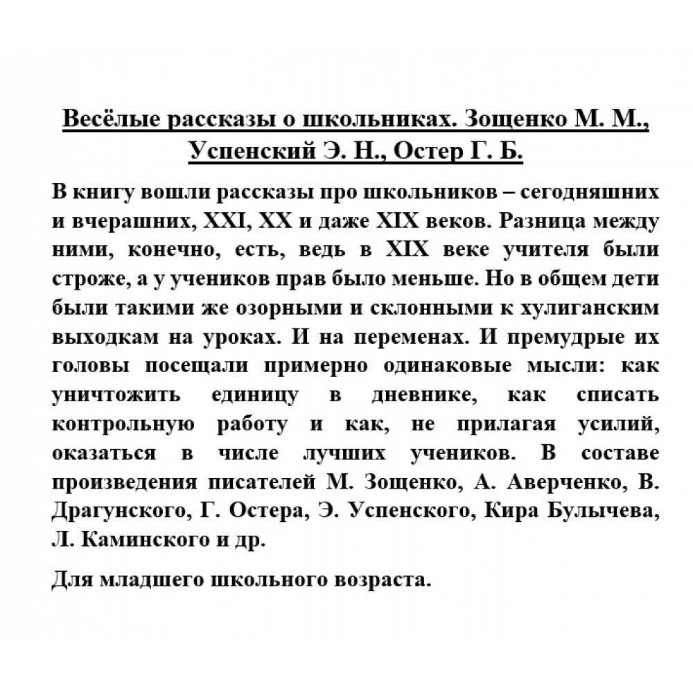 На сегодняшний день товар «Книга: Весёлые рассказы о школьниках (Михаил Михайлович Зощенко, Эдуард Николаевич Успенский, Григорий Бенционович Остер); АСТ, 2023» можно купить с кешбеком в 4 магазинах: book24, Буквоед, Яндекс.Маркет, Читай-город
