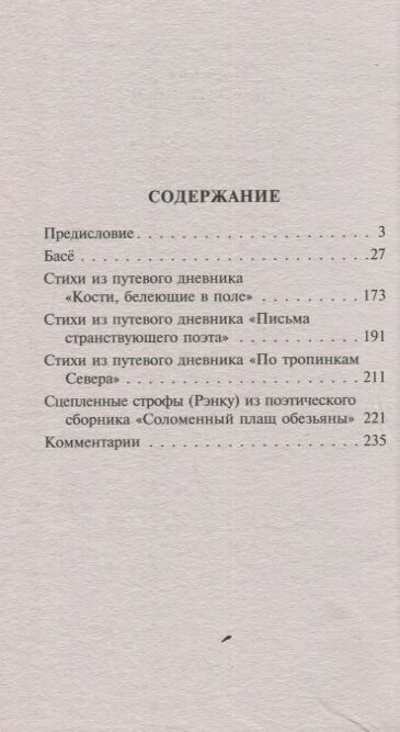 Прекрасное (также традиционное для изданий Басё) 20-страничное предисловие Веры Николаевны Марковой, одной из самых известных переводчиц японской поэзии в нашей стране, награждённой за свои труды японским орденом Священного Сокровища. Её же - комментарии и, конечно же, перевод стихотворений.