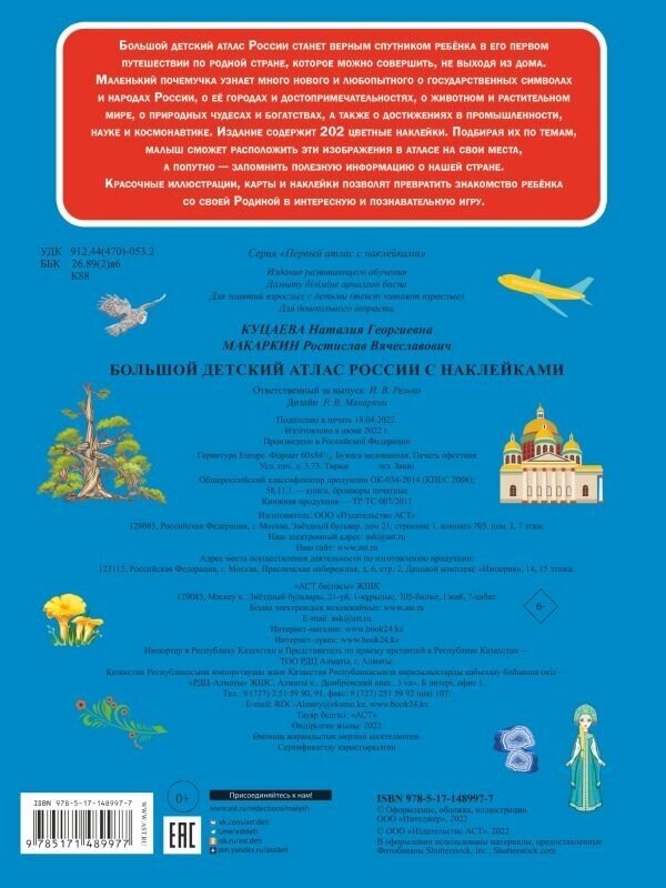 Сервис сравнения цен СкидкаГИД предлагает сравнить цены на товар «Книга: Большой детский атлас России с наклейками (Макаркин Ростислав Вячеславович (соавтор), Куцаева Наталия Георгиевна); АСТ, Малыш, 2022»