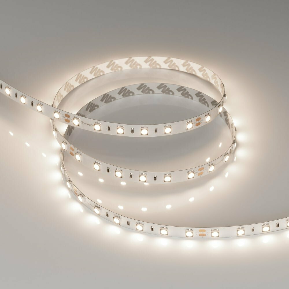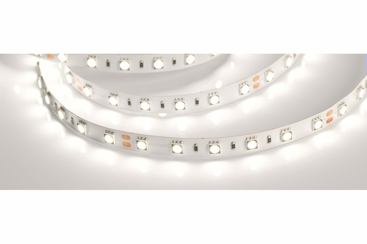 Светодиодная лента RT-B60, открытая. Светодиоды 5060, 60 шт/м (300 шт на 5 м), белая плата, ширина 10 мм, скотч 3M. Цвет ДНЕВНОЙ 4000 K, цветопередача CRI 95..98, угол 120°. Питание 24V, мощность 14.4 Вт/м (72 Вт на 5 м). Размеры 5000x10x2.2 мм. Мин. отрезок 100 мм, 6 светодиодов. Цена за 1 м.