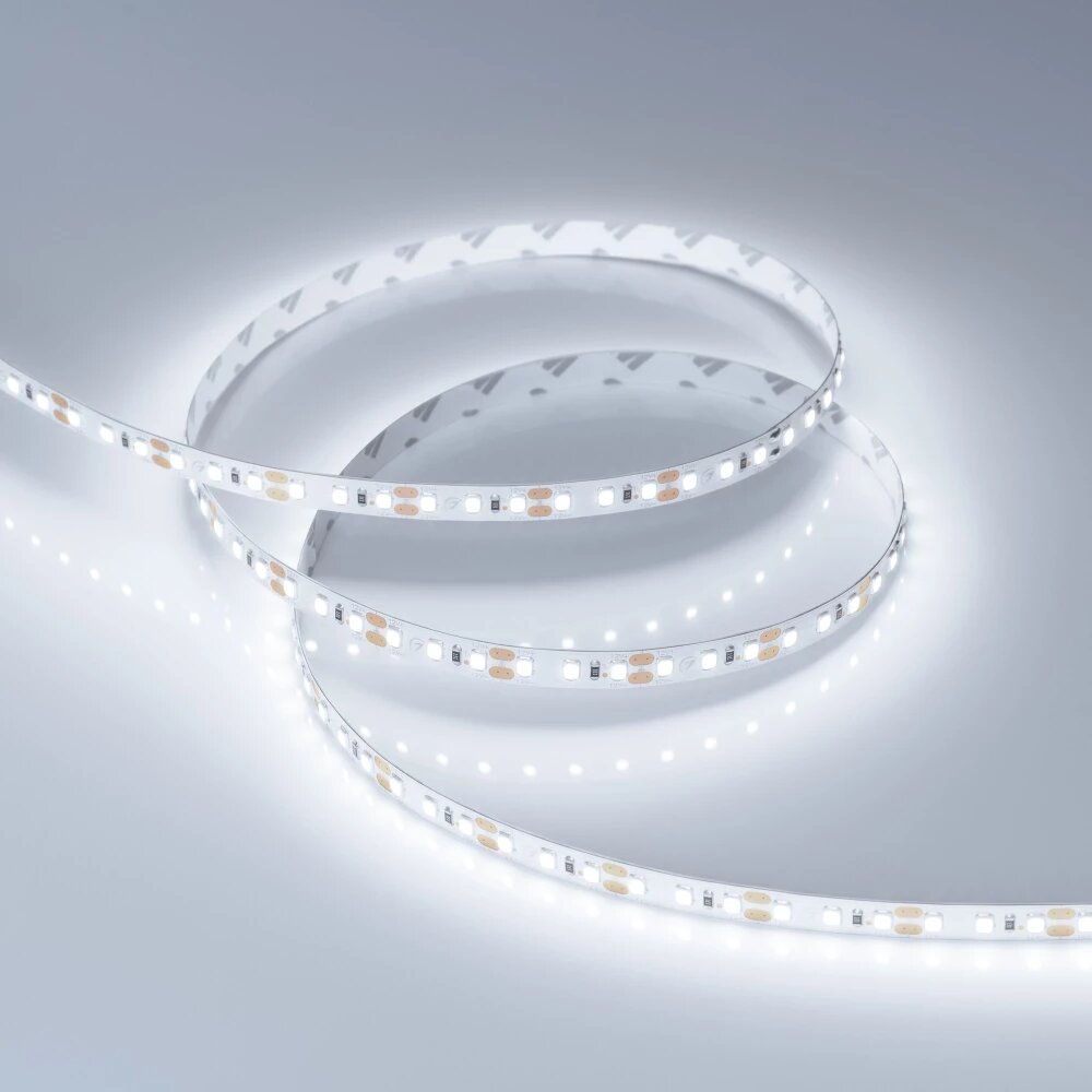 Светодиодная лента RT-A120, открытая. Светодиоды 2835, 120 шт/м (600 шт на 5 м), белая плата, ширина 8 мм, скотч 3M. Цвет ХОЛОДНЫЙ 8000 K, цветопередача CRI>85, угол 120°. Питание 12V, мощность 9.6 Вт/м (48 Вт на 5 м). Размеры 5000x8x1.5 мм. Мин. отрезок 25 мм, 3 светодиода. Цена за 1 м.