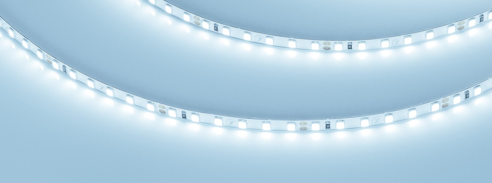 Светодиодная узкая лента RT-A120, открытая. Светодиоды 2835, 120 шт/м (600 шт на 5 м), белая плата, ширина 5 мм, скотч 3M. Цвет ХОЛОДНЫЙ 8000 K, цветопередача CRI>85, угол 120°. Питание 24V, мощность 9.6 Вт/м (48 Вт на 5 м). Размеры 5000x5x1.5 мм. Мин. отрезок 50 мм, 6 светодиодов. Цена за 1 м.