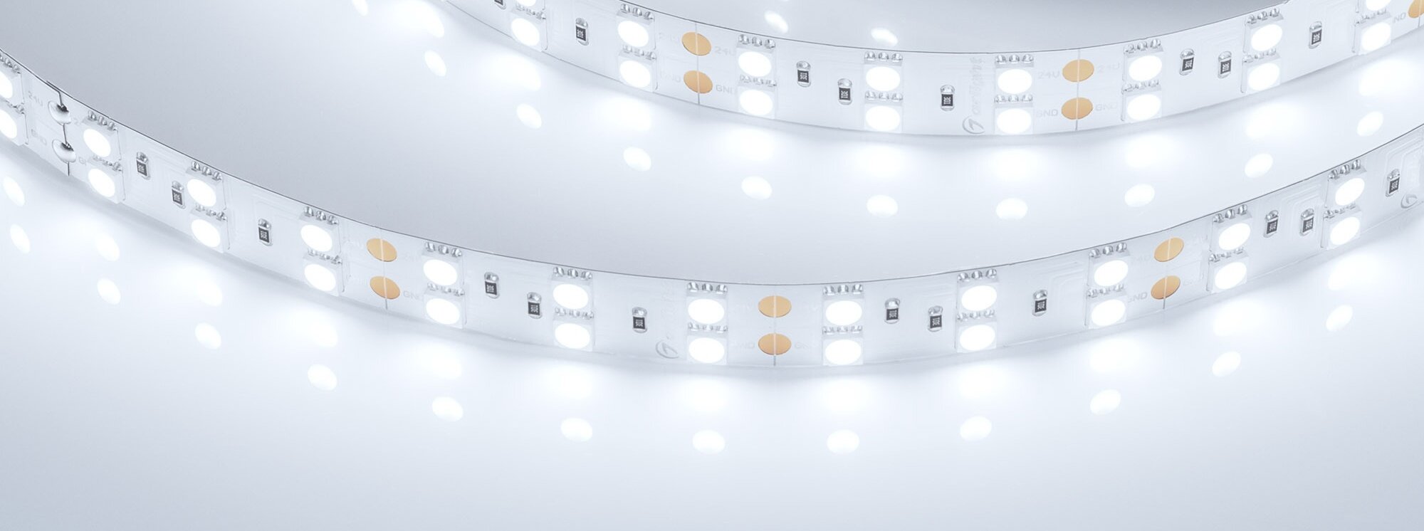 Светодиодная широкая лента RT-B120, открытая. Светодиоды 5060, 120 шт/м (600 шт на 5 м), белая плата, ширина 15 мм, скотч 3M. Цвет БЕЛЫЙ 6000 K, цветопередача CRI>85, угол 120°. Питание 24V, мощность 28.8 Вт/м (144 Вт на 5 м). Размеры 5000x15x2.2 мм. Мин. отрезок 50 мм, 6 светодиодов. Цена за 1 м.