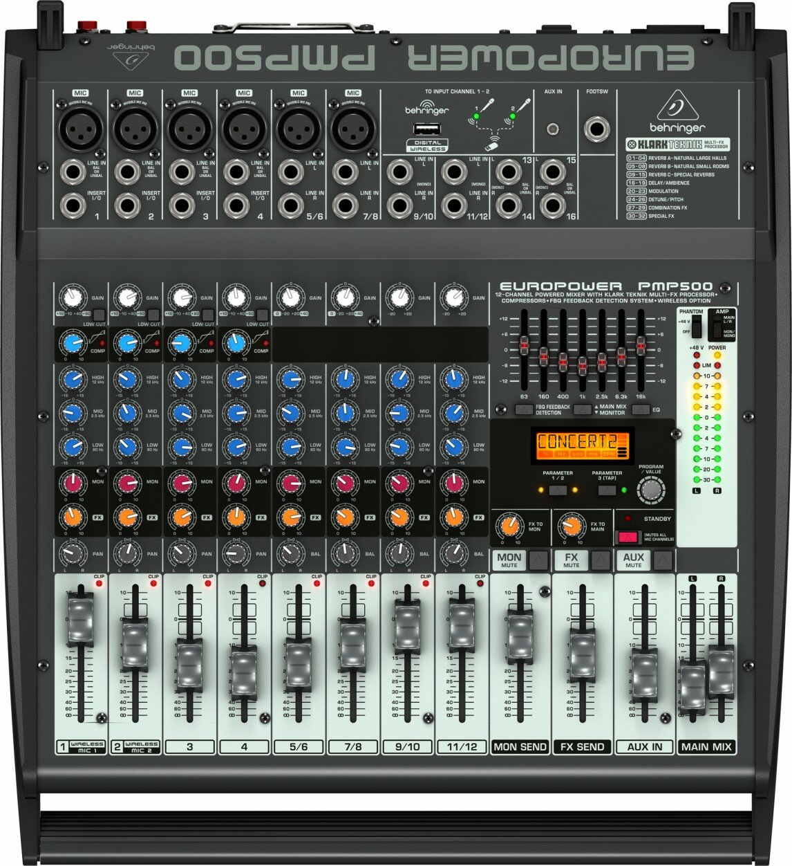 Двенадцатиканальный микшер PMP500 снабжен шестью высококлассными микрофонными предусилителями (два из которых могут работать с беспроводной системой ULM), фирменным «однокнопочным» компрессором, четырьмя стерео каналами, плюс два дополнительных стерео входа и входом 1 / 8 '' Aux для максимальной вариабельности и многофункциональности. Для дополнительных профессиональных возможностей разработчики добавили процессор эффектов KLARK TEKNIK 24-bit Multi-FX с 32 эффектами студийного класса, включая реверберацию, дилэй, питч шифтер и многое другое. Кроме этого прибор оснащен отличным семиполосным эквалайзером с запатентованной системой обнаружения обратной связи FBQ – для работы без негативных эффектов, влияющих на звук.