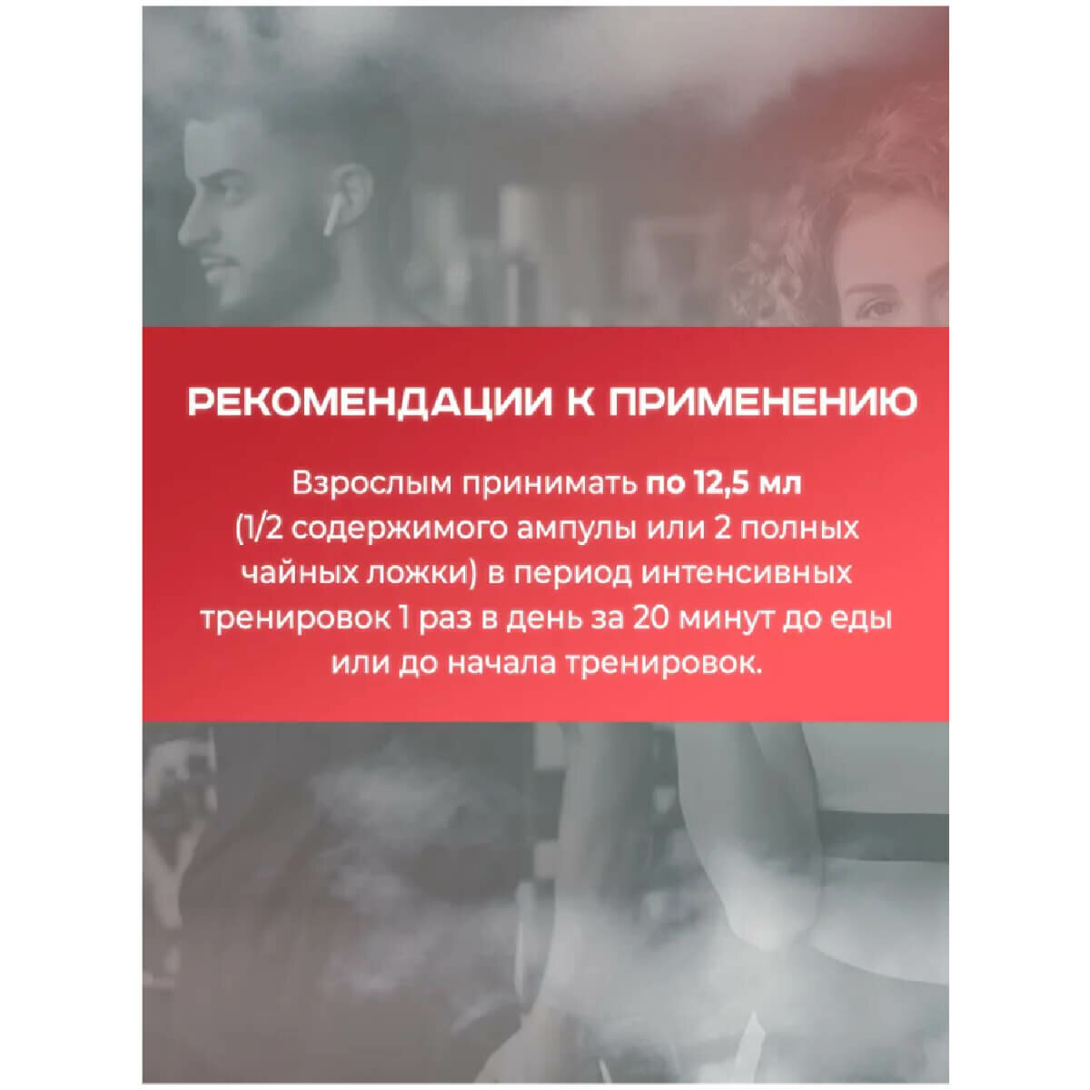Рекомендации по применению: принимать по 1/2 ампулы за 30 минут перед тренировкой. Рекомендуемая продолжительность приема в зависимости от интенсивности нагрузок, массы тела, возраста и уровня подготовки в соответствии с программой тренировок по рекомендации специалиста. Продукт не рекомендуется принимать детям до 18 лет, беременным и кормящим женщинам.
