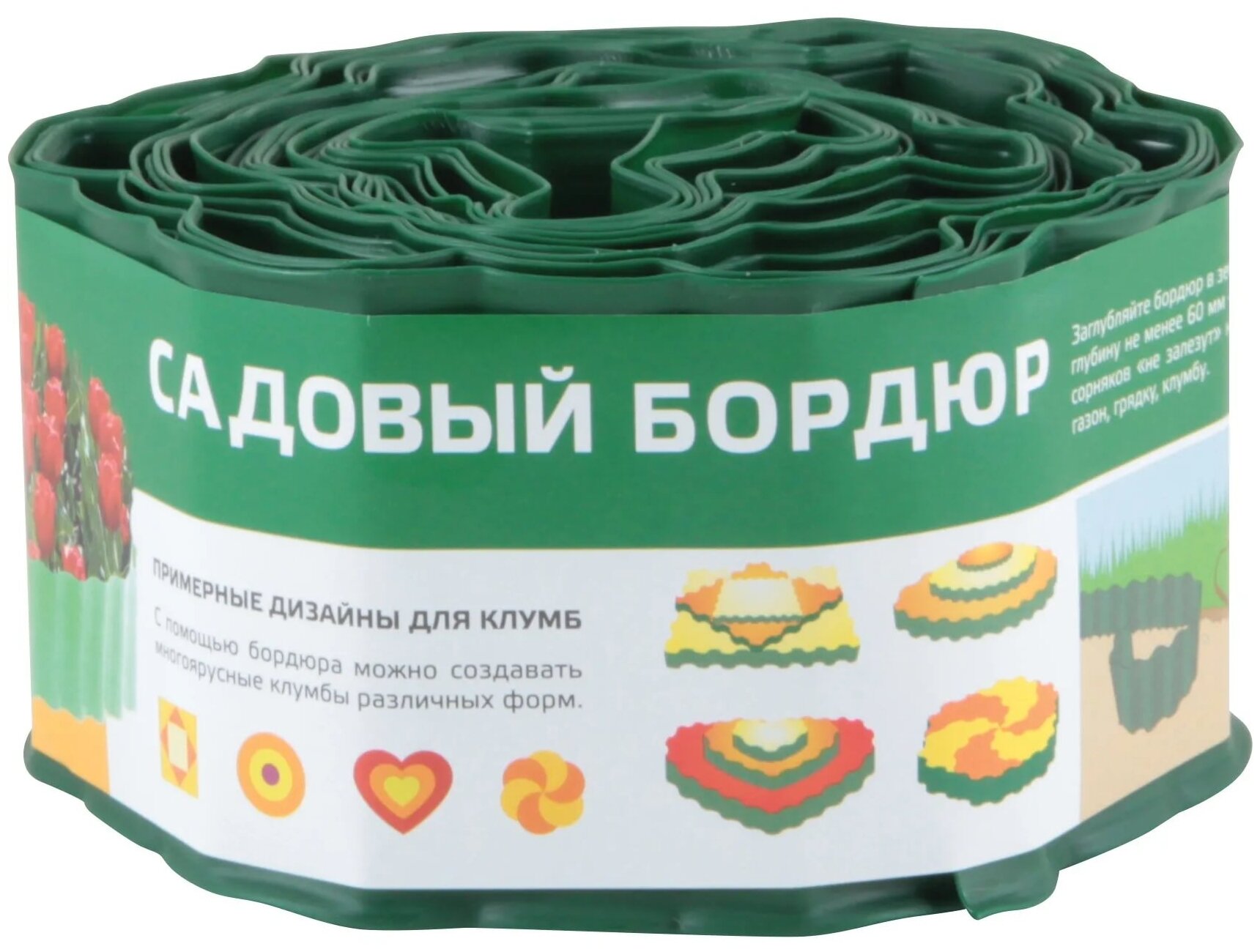 Назначение: для оформления клумб, грядок, газона, приствольных кругов деревьев и кустарников. Материал: пластик, содержащий добавки, повышающие устойчивость материала к воздействию ультрафиолетовых лучей. Высота ленты - 100мм, Длина ленты - 9м, Толщина ленты - 0,7мм, Диаметр рулона - 240мм, Цвет - зеленый.