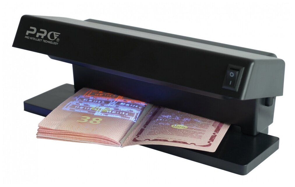 Поддельный документ или банкнота, выполненные на обычной бумаге, ярко люминесцируют в УФ-свете и легко обнаруживают себя при проверке в PRO 12. Банкноты удобно проверять как по одной, так и веером.