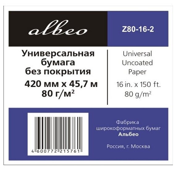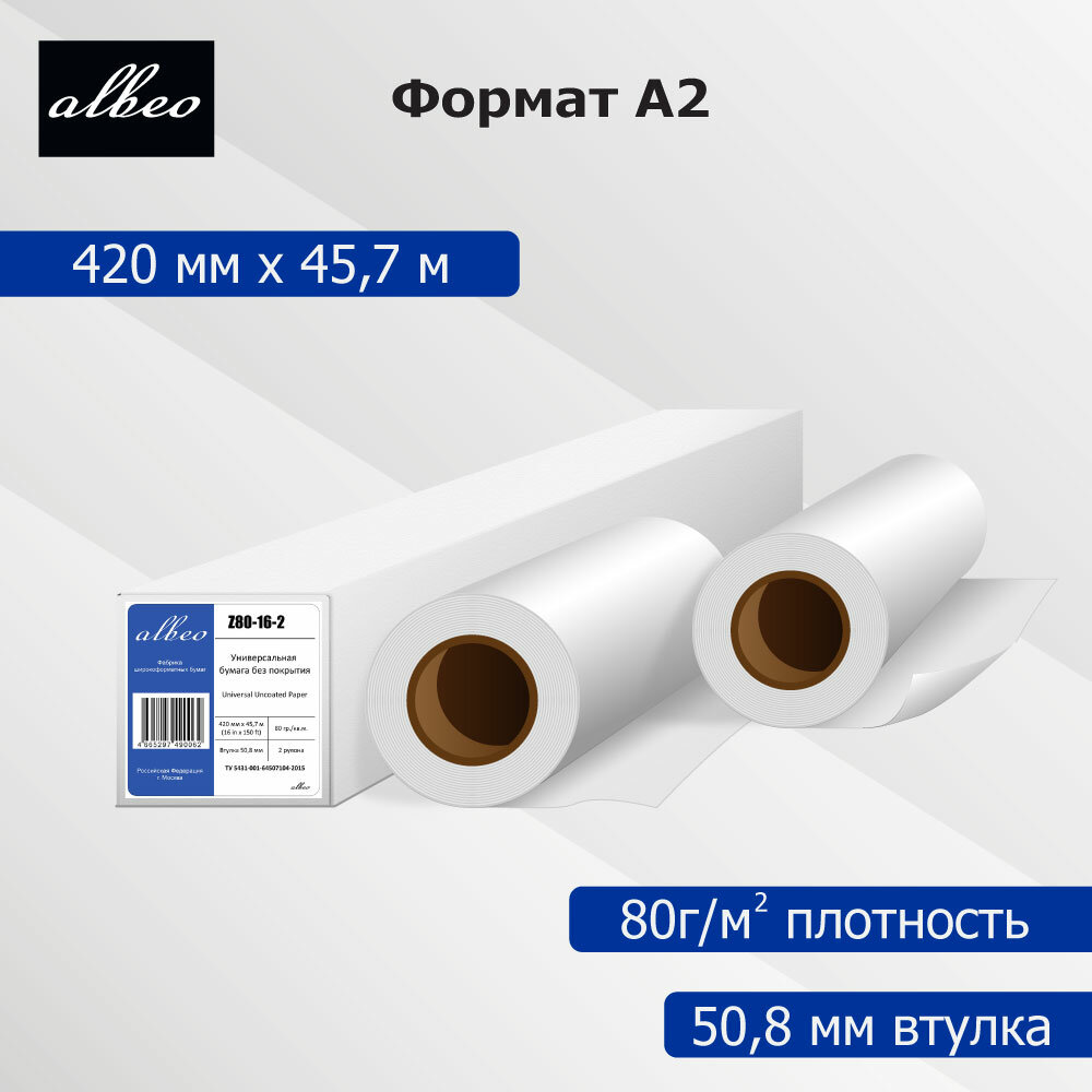 Рулонная бумага без покрытия Albeo Universal Uncoated Paper 80 г/м2, 0.420x45.7 м, 50.8 мм, 2 рулона (Z80-16-2)