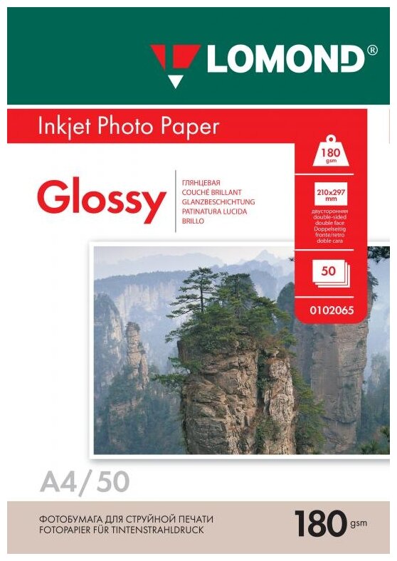 Фотобумага Lomond для струйной печати, A4, 180 г/м2, 50 листов, двусторонняя, глянцевая/глянцевая (0102065)