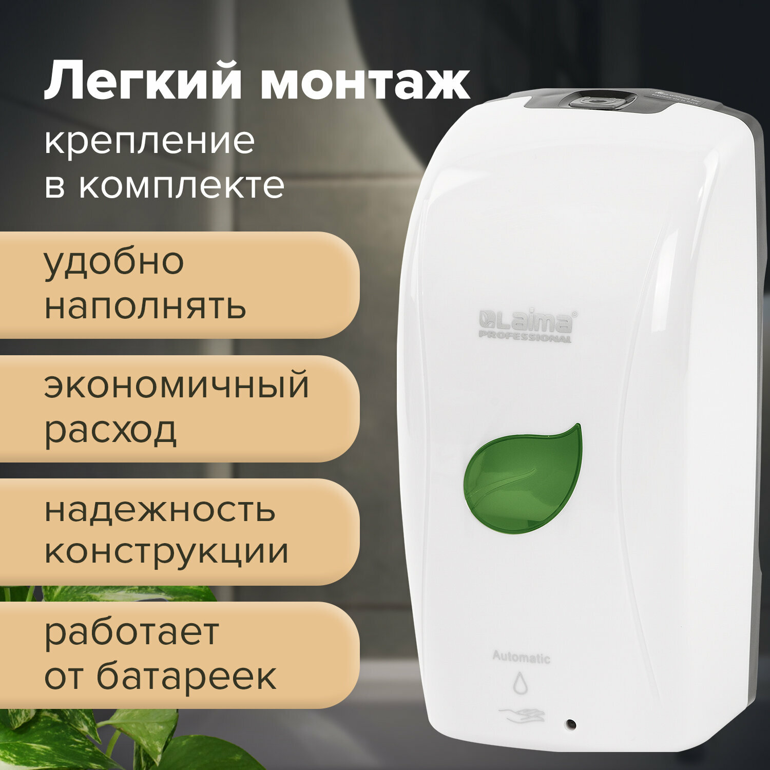 Наливной сенсорный диспенсер для мыла-пены LAIMA PROFESSIONAL ECO предназначен для экономичного дозирования жидкого мыла-пены в туалетных комнатах. Идеально подойдет для мест с любой проходимостью. Повышенный объем — 1,3 л. Корпус изготовлен из ударопрочного ABS-пластика. Обеспечивает высокую гигиеничность. Выдача мыла-пены осуществляется экономичными порциями. Сочетается с расходными материалами других производителей. Чувствительность сенсора — до 9 см. Крепежные материалы в комплекте. Гарантия 12 месяцев. Размер — 272×130×120 мм. Работает от шести батареек АА. Батарейки в комплект не входят.