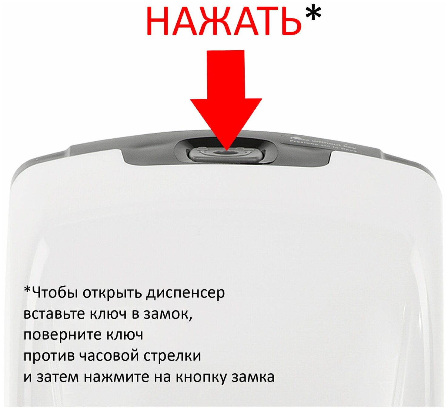 Диспенсер оборудован пластиковым замком с ключом. Чтобы открыть диспенсер, вставьте ключ в замок, поверните ключ против часовой стрелки и затем нажмите на кнопку замка.