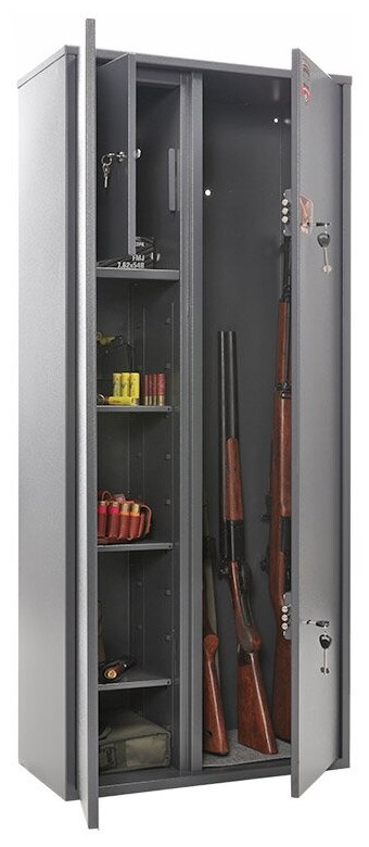 Оружейный сейф Aiko относится к категории качественных охотничьих шкафов эконом-класса, российского производства. Если вы заинтересованы в том, чтобы надлежащим образом содержать пять единиц длинноствольного оружия, изолируя его от излишнего внимания детей и домашних, то сейф для оружия прекрасно вам подходит. Оружейный сейф по всем параметрам отвечает требованиям МВД РФ к хранению огнестрельного оружия и боеприпасов; однако стоит учесть, что степень его взломостойкости не особенно высока, и от опытного грабителя он может не уберечь. Для того, чтобы исключить вероятность похищения сейфа для хранения оружия из комнаты, а также повысить его устойчивость, лучше всего прикрепить его к полу или стене; анкерные отверстия для этого предусмотрены.Корпус оружейного сейфа сконструирован из стальных листов толщиной 1.5 миллиметра. Дверь запирается двумя замками высокого качества: один – трёхригельный ключевой замок сувальдного типа (II класс), а второй – врезной «почтовый» замок.Вертикальная перегородка разделяет пространство сейфа оружейного надвое: в одной части располагаются полочки и отделение для патронов размерами 232 х 238 х 250 мм, снабжённое собственным замком, а во второй – ложементы, которые аккуратно фиксируют стволы, создавая условия для исключительно удобного хранения.Характеристики сейфа для оружия:- Внешние размеры (В х Ш х Г): 1400x620x300 мм*- Внутренние размеры (В х Ш х Г): 1380x617x280 мм- Вес: 41 кг- Количество полок: 3- Объем: 238/14 лОсобенности : - толщина металла двери и корпуса 1.5 мм- комплектуются двумя ключевыми замками- наличие анкерных отверстий для крепления сейфа металлического к стене. Документы:- Сертификат соответствия Ростест- Декларация о соответствии- Cейф для хранения оружия соответствует (по заключению НИЦ «Охрана» МВД РФ) требованиям МВД РФ к хранению огнестрельного оружия.