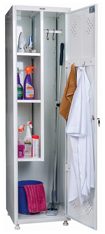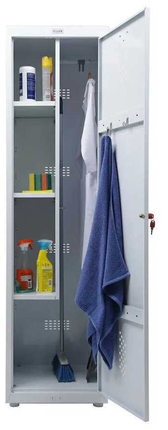 Медицинский шкаф МД 1 ШМ-SS (11-50) предназначен для хранения рабочей и личной одежды в больницах, родильных домах, лечебных стационарах и других помещениях, где требуется соблюдение санитарно-гигиенических норм при хранении одежды.Изготавливается из высокопрочной стали с применением гигиенического порошкового покрытия, устойчивого к влажной уборке и средствам дезинфекции и предохраняющего шкаф от коррозии, царапин и мелких повреждений.В комплект поставки входят: четыре регулируемые опоры (высота – 100 мм, диапазон регулировки – 95-125 мм), вертикальная перегородка, 3 полки, держатель для швабры, крючки и перекладина для плечиков.Двери шкафа оснащены вентиляционными отверстиями для воздухообмена и информационными табличками для имён. Модель предусматривает возможность смены стороны открывания дверей.На шкаф МД 1 ШМ-SS устанавливаются ключевые замки «Практик» с возможностью смены цилиндра и мастер-ключом. На заказ возможна установка бесключевого замка EURO-LOCKS A129 с устройством под навесной замок.Модульная конструкция позволяет скреплять шкафы между собой. Изделия поставляются в разобранном виде и предусматривают сборку саморезами (инструкция прилагается).Медицинский шкаф МД 1 ШМ-SS полностью отвечает нормам СанПиН 2.1.3.1375-03. Имеет регистрационное удостоверение, по требованию может быть предоставлена лицензия на производство медицинской техники.Данный товар не облагается НДС.Особенности:- Комплектация: вертикальная перегородка, 3 полки под хозяйственный инвентарь, держатель для швабры, крючки для одежды, перекладина для плечиков;- Ключевой замок «HILFE» (2000 комбинаций) с возможностью смены цилиндра + мастер-ключ;- Вентиляционные отверстия на двери;- В комплект поставки входят четыре регулируемые опоры (диапазон регулировки – 30 мм);- Высота с установленными опорами – 1900 мм;- Способ сборки: саморезы;- Конструкция шкафов позволяет скреплять их между собой;- Покрытие: гигиенически безопасное, коррозийно-устойчивое порошковое.