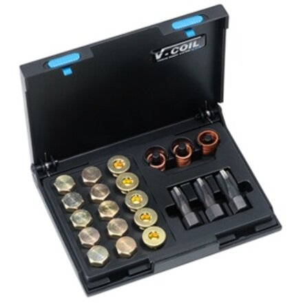 Набор для ремонта резьбы пробок масляных поддонов М13х1,5 - М17х1,5 VOLKEL V-Coil VC-19120. Набор предназначен для ремонта поврежденного или изношенного резьбового соединения пробки масляного поддона. Позволяет восстановить дорогостоящую деталь с помощью создания надежной и долговечной резьбы и новой пробки. В наборе представлен инструмент и комплектующие для наиболее распространенных типов масляных поддонов. Подходит для автолюбителей и реставраторов раритетных автомобилей, сервисов и авторемонтных предприятий. Пробки и шайбы, входящие в набор, изготовлены из латуни и алюминия.