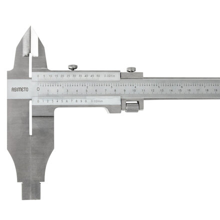 Штангенциркуль нониусный ASIMETO 0302-12-02 серии 302 из нержавеющей стали с губками для внутренних и наружных замеров. Предназначен для измерения линейных размеров малогабаритных деталей.