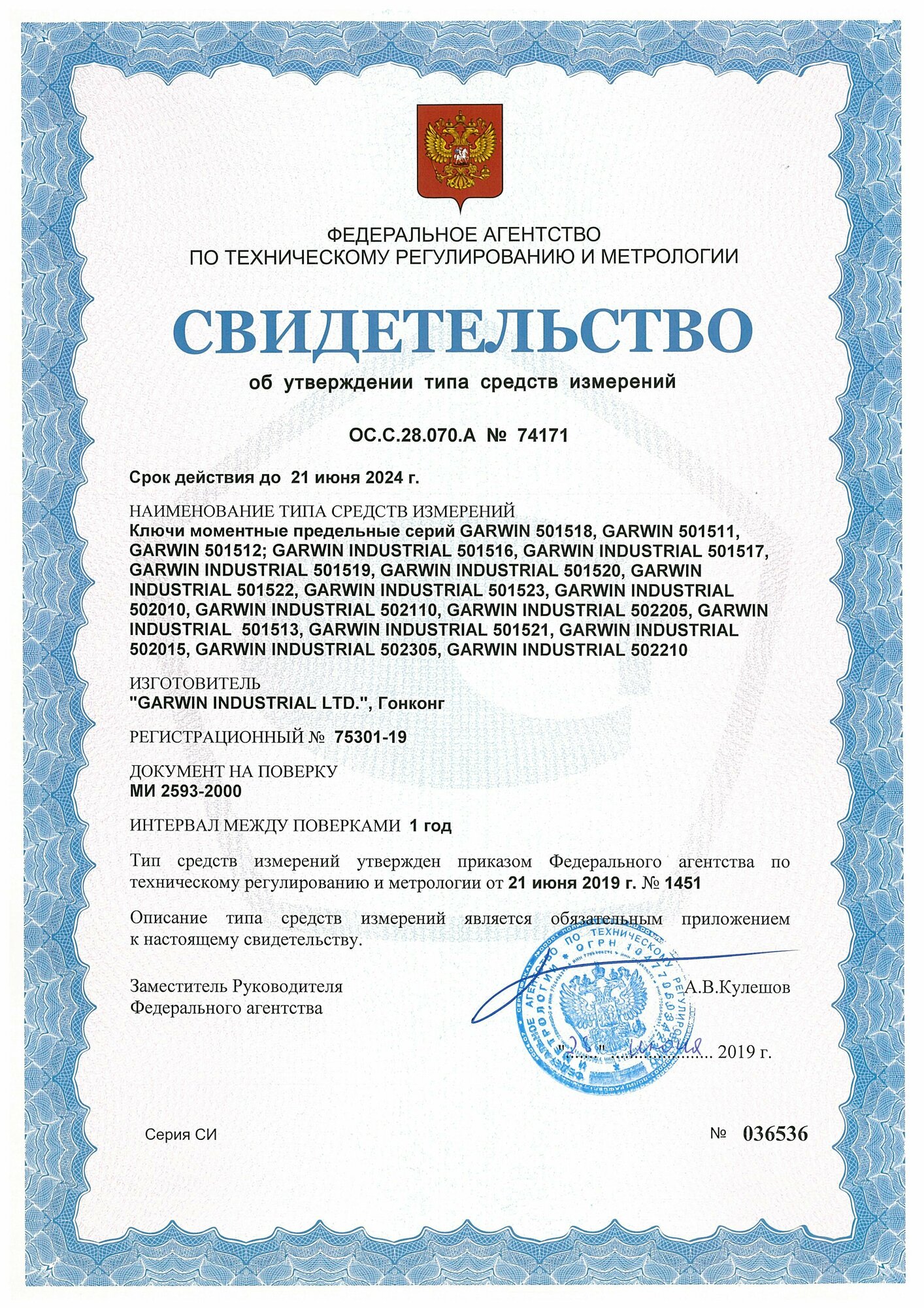 Инструмент внесен в Госреестр средств измерений РФ под номером 75301-19.