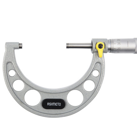 Микрометр гладкий механический для наружных измерений со скобой Asimeto 101-06-2 - универсальный прибор для измерений линейных размеров абсолютным или относительным контактным методом с низкой погрешностью в области малых размеров. Преобразовательным механизмом является микропара “винт - гайка”.