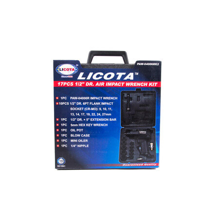 Набор с гайковертом Licota PAW-04006RK2. Комплект из 16 предметов в пластиковом кейсе включает гайковерт пневматический ударный Licota PAW-04006R в металлическом корпусе с ударным механизмом Twin Hammer, набор ударных головок и аксессуары. Используется для откручивания-закручивания болтового крепежа различных узлов автомобиля (двигателя, ходовой части, подвески), коммерческого шиномонтажа.