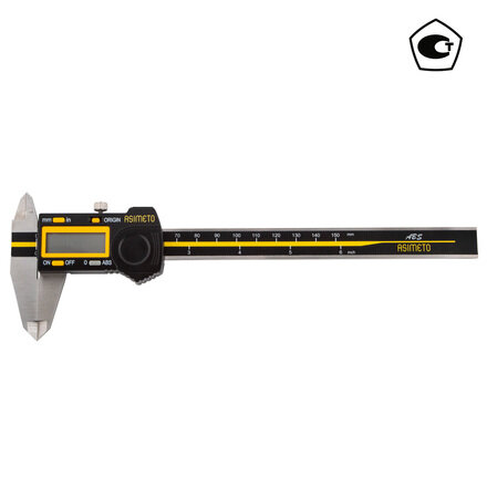 Цифровой штангенциркуль ASIMETO 307-62-2 для измерения наружных и внутренних размеров. При работе с цифровыми штангенциркулями результат измерений отображается на дисплее. Инструмент используют, когда данные необходимо получить быстро, без расчёта дополнительных шкал.
