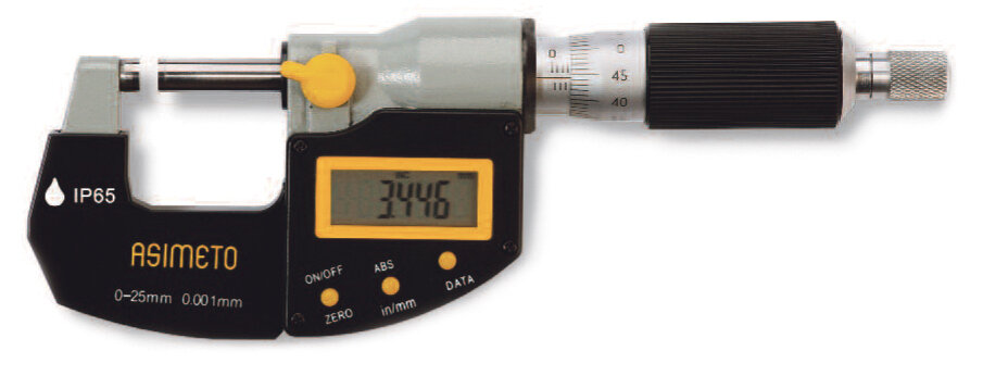 Микрометр гладкий цифровой для наружных измерений Asimeto 105-02-4 - универсальный прибор для измерений линейных размеров абсолютным или относительным контактным методом с низкой погрешностью в области малых размеров. Преобразовательным механизмом является микропара “винт - гайка”.