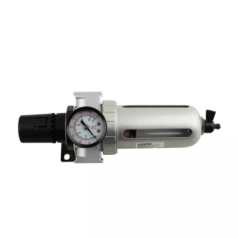 Фильтр-осушитель воздушный с регулятором давления Licota PAP-C206A для подготовки воздуха в пневмосистеме. Эффективно осушает и очищает магистральный воздух от твердых частиц, масла и влаги, позволяет регулировать выходное давление Оборудован автоматическим клапаном сброса конденсата.