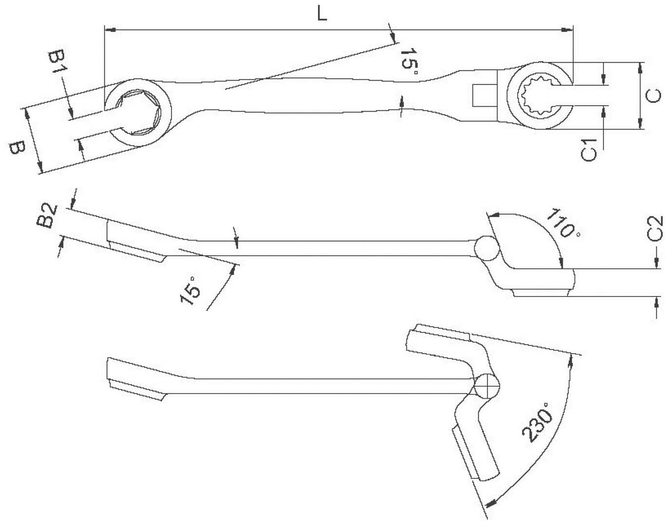 Применяется в ситуациях, когда применение рожкового ключа затруднено или нежелательно, а накидного - невозможно. Имеет две рабочие части: 6-гранную и 12-гранную на шарнире.