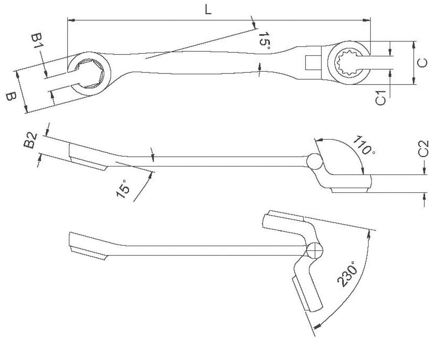 Применяется в ситуациях, когда применение рожкового ключа затруднено или нежелательно, а накидного - невозможно. Имеет две рабочие части: 6-гранную и 12-гранную на шарнире.