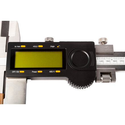 Цифровой штангенциркуль ASIMETO 315-32-8 для измерения наружных и внутренних размеров. При работе с цифровыми штангенциркулями результат измерений отображается на дисплее. Инструмент используют, когда данные необходимо получить быстро, без расчёта дополнительных шкал.
