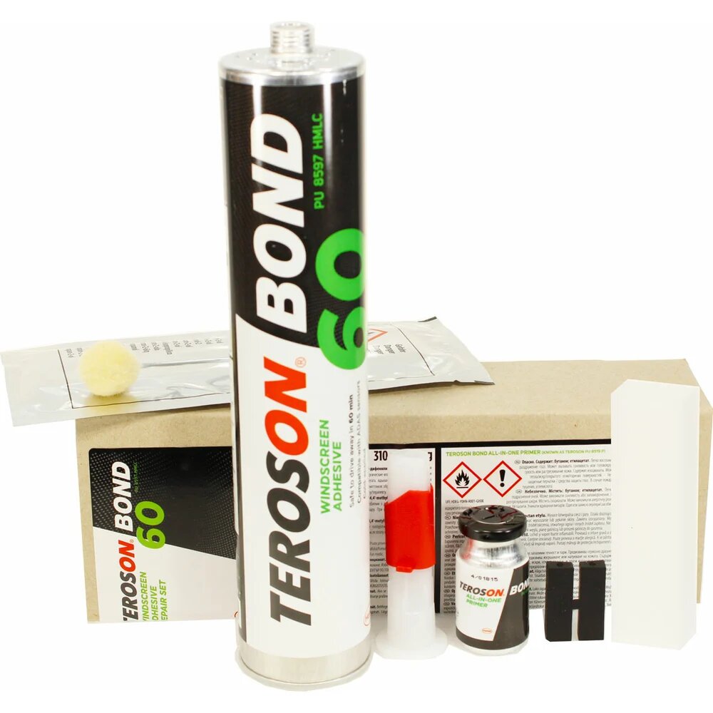 TEROSON BOND60 SET - набор с однокомпонентным клеем для стекол, используемый при замене остекления в автомобиле, где не требуется повышенная гарантия безопасности. Минимальное время готовности составляет 1 час после нанесения, согласно FMVSS (США) и 4 час согласно самому жесткому европейскому стандарту на краш-тест.В набор Terostat 8597 HMLC SET входит:клей-герметик Terostat 8597 HMLC (картридж 310 мл);насадка на картридж;праймер;аппликатор;салфетка для очистки поверхности;струна для резки стекла;инструкция по применению.Особенности:высокое сопротивление сдвигу, низкая электропроводность;хорошая стойкость клеевого валика к заваливанию;не "тянется" за инструментом;рекомендовано производителем оригинального оборудования.Область применения:Фиксация передних, задних и боковых стекол к кузовам автомобилей, автофургонов, железнодорожных транспортных средств и машин специального назначения.Метод применения:Подготовка поверхностиДля достижения наилучших результатов сопрягаемые поверхности должны быть очищены, обезжирены и высушены. Для очистки поверхности рекомендуется применение очистителей TEROSON VR 10 / VR 20. Убедитесь, что на поверхности стекла нет повреждений и дефектов. Для очистки поверхности и получения оптимальной адгезии рекомендуется отшлифовать линию склеивания стекла мягким абразивным материалом. После шлифования очистите склеиваемые поверхности при помощи TEROSON VR 20 и дайте очистителю высохнуть в течение 2 минут. Очищать поверхность от остатков клеевого шва после удаления старого стекла не обязательно. Однако, если остаточный слой старого клея должен быть непременно удален, перед нанесением герметика необходимо соблюдать время испарения очистителя в течение 2 минут, т.к. склеиваемые поверхности должны быть абсолютно сухими.НанесениеКлей для прямого остекления TEROSON PU 8597 наносится непосредственно из алюминиевого картриджа или фольгированной упаковки при использовании пневматического пистолета с механическим управлением либо пистолета с питанием от аккумуляторной батареи.