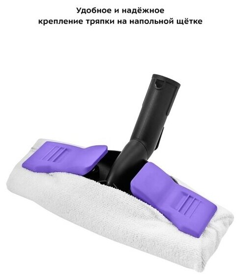 На напольную щётку устанавливается тряпка с помощью специальных зажимов. Такая конструкция надёжно фиксирует её и не позволяет съезжать с щётки во время уборки.Управление одной рукой