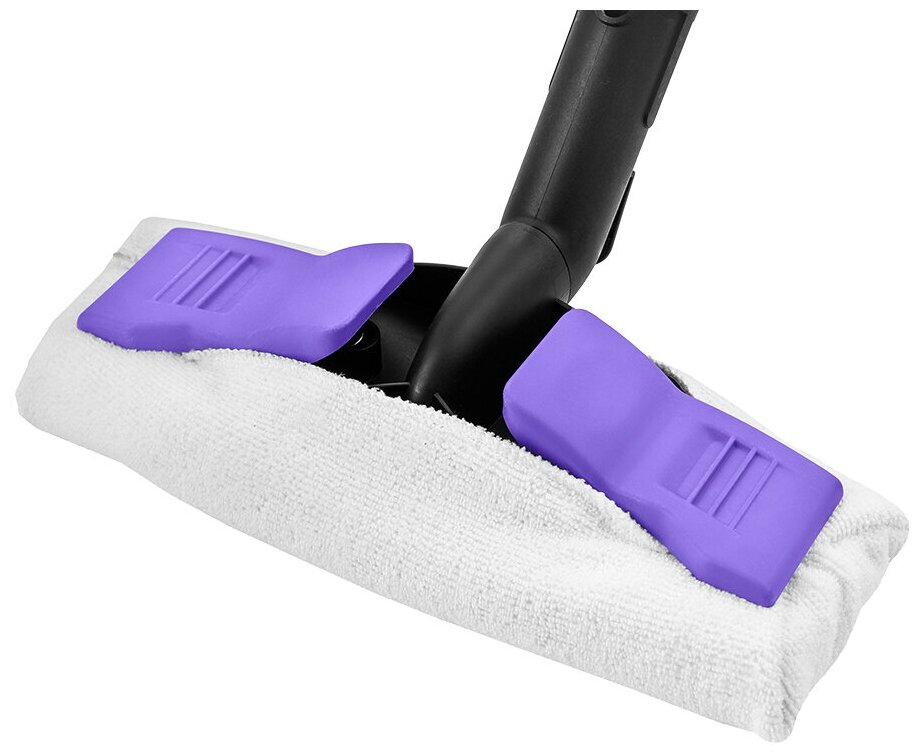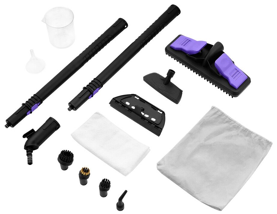 Скребок для стекла используется для чистки окон, зеркал, кафеля. Струйная насадка подходит для чистки плинтусов, щелей и других углов. Щётки - для удаления стойких загрязнений. Насадкой для отпаривания можно отпаривать одежду, шторы, мягкую мебель.Комфортная уборка полов