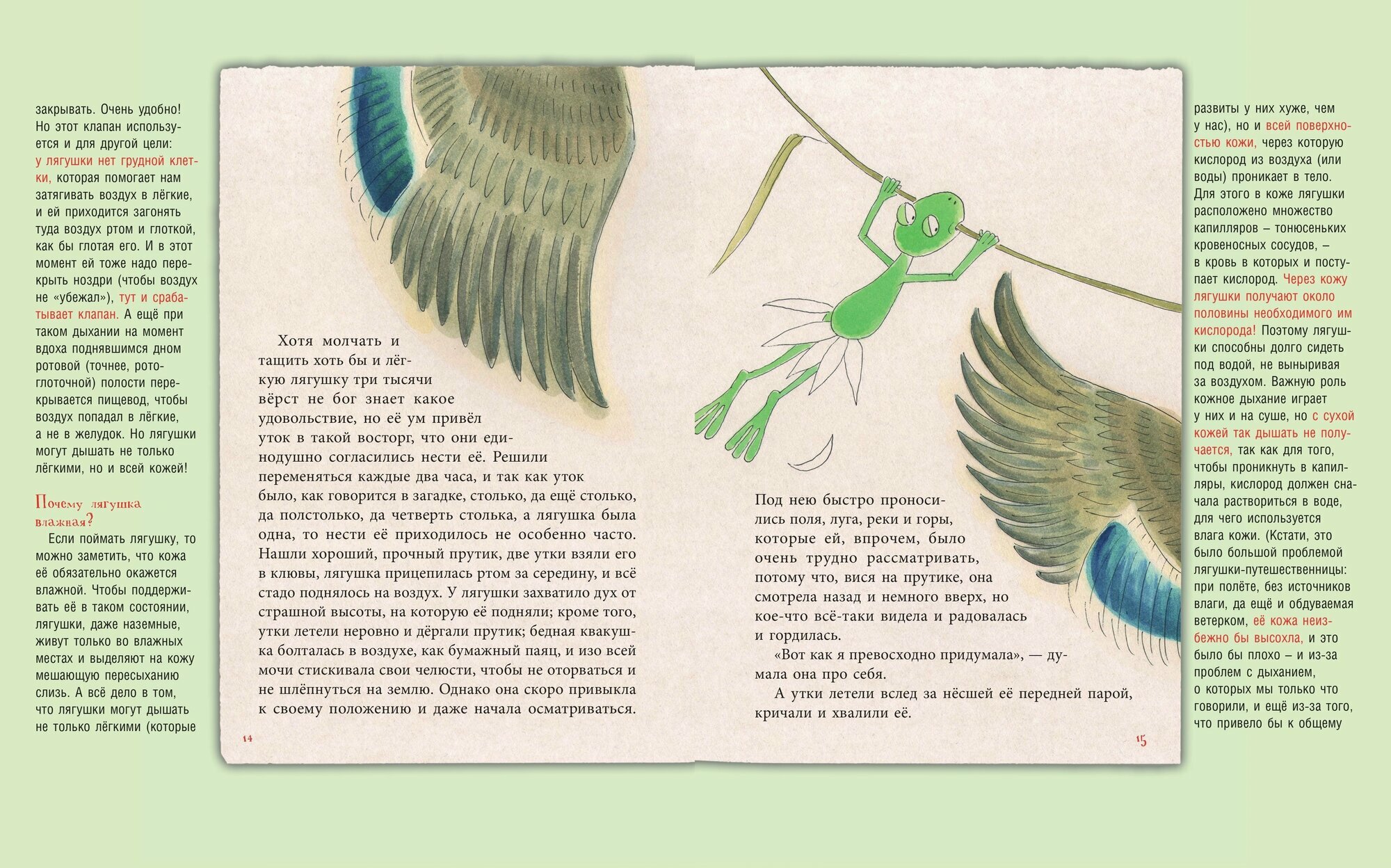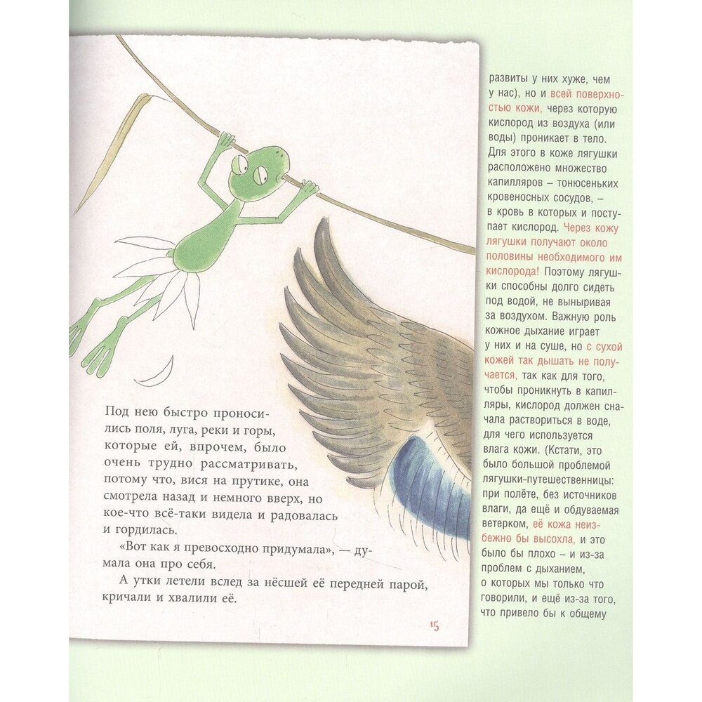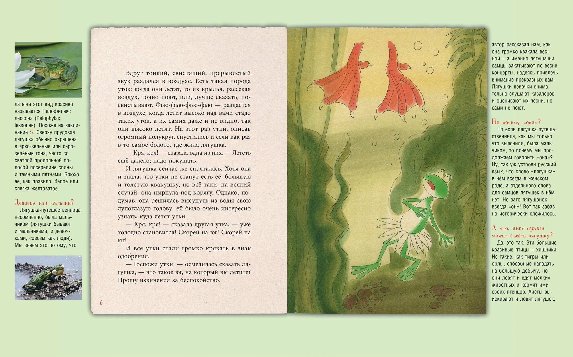Замечательное оформление для такой небольшой сказки! Комментарии научные, но очень просто написаны, детям читать очень интересно. Параллельно тексту сказки даются научные пояснения: о самих лягушках, чем они питаются, как дышат, как устроена кожа, etc., что в сказке основано "на науке", а что красивая фантазия :) Читать детям очень познавательно, а для взрослых эта сказка воспринимается по-новому, очень "обогатилась" благодаря таким пояснениям. Также очень позитивные, милые иллюстрации. Рекомендую к прочтению!