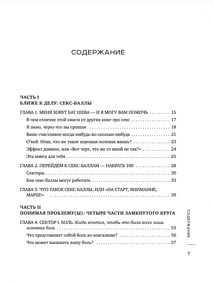 Доктор Маркус Бат Шева — сексолог и психотерапевт, уже более 20 лет помогает женщинам с проблемами в сексуальной жизни. В своей книге она делится революционной системой, которая поможет самостоятельно определить, какие факторы влияют на вашу интимную жизнь — с помощью тестов и подсчитав количество баллов в четырех ключевых областях: боль, возбуждение, либидо и оргазм. А затем вернуть недостающие баллы в каждой из областей.