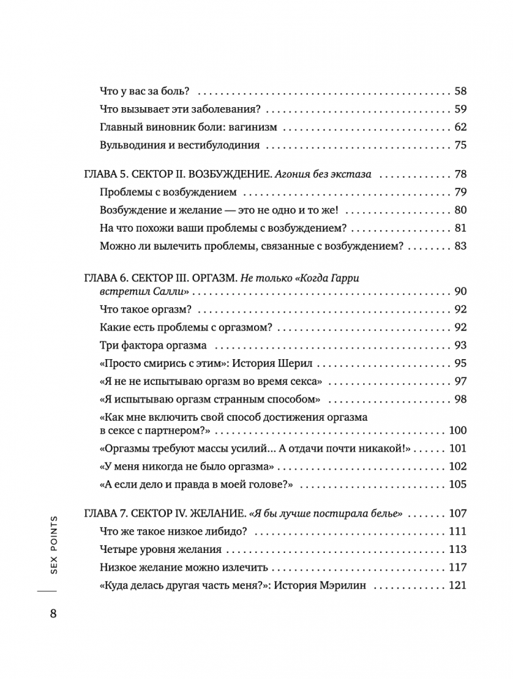 «Эта книга говорит: ты не одинока в своих проблемах, и тебе доступен классный секс, если ты готова взять свою сексуальную жизнь под контроль. Доктор Бат Шева предлагает простую систему, которая позволит каждой женщине разложить проблемы в интимной жизни по полочкам и начать наслаждаться сексом вне зависимости от возраста, физиологических изменений и наличия партнера. “Sex points” вдохновляет на изменения и дает в руки все инструменты для них». — Екатерина Манькова, автор Telegram-канала и книги «Катины секреты»