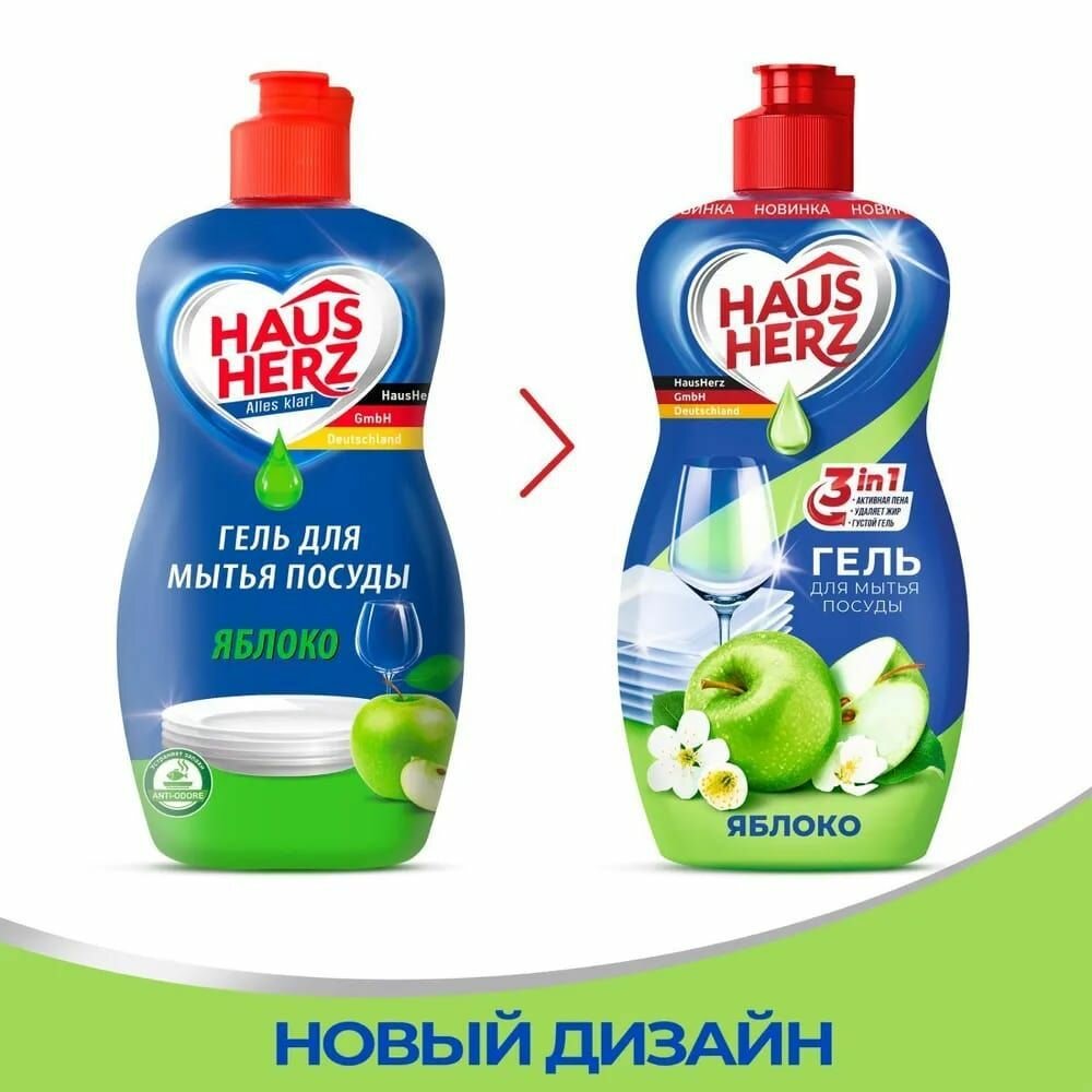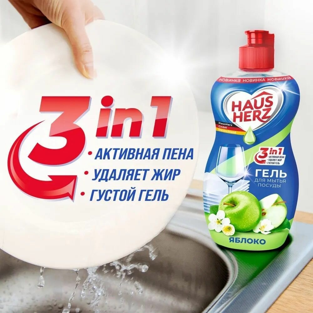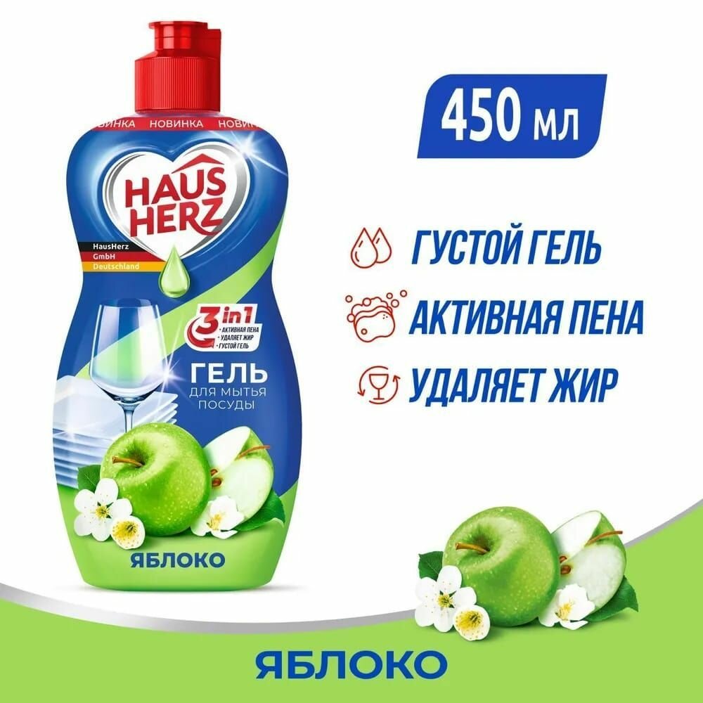Средство для мытья посуды Haus Herz яблоко безупречно и бережно отмоет вашу посуду, придав ей блеск и сияние. Без агрессивных компонентов и хлора. Всего одна капля создает обильную пену, удаляя жир, как в холодной, так и горячей воде. Бережно воздействует на кожу рук.