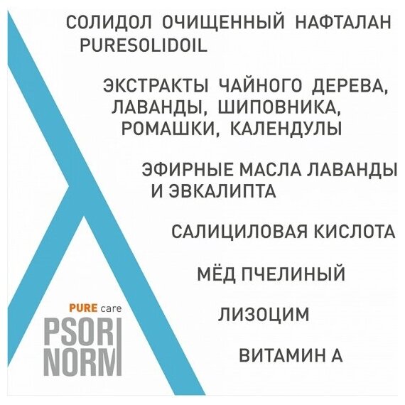 | Состав | солидол очищенный нафталан PURESOLIDOIl, салициловая кислота, лизоцим, мед пчелиный, экстракты чайного дерева, лаванды, шиповника, ромашки, календулы, витамин A, эфирные масла лаванды, эвкалипта |