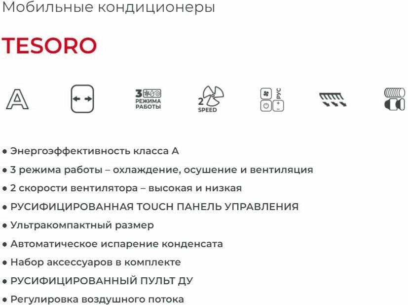 Мобильные кондиционеры серии TESORO итальянского бренда Royal Clima представлены на климатическом рынке тремя моделями производительностью в охлаждаемом режиме 1,65, 2,15 и 2,79 кВт. Приборы идеальны для работы в режимах вентиляции, осушения и охлаждения воздуха в помещениях бытового типа и относятся к А классу энергоэффективности.