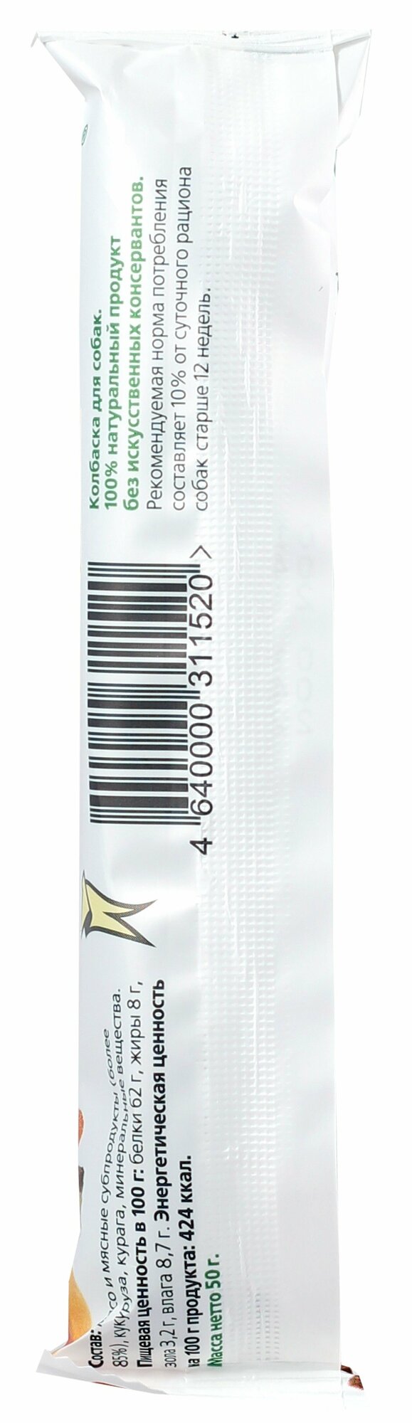 - Упаковка содержит колбасоку длиной 15 см и диаметром 2,5 см в индивидуальной упаковке, весом 50 г.