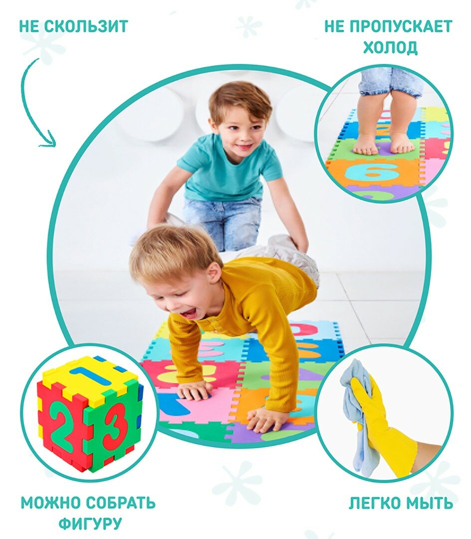 Детский коврик, состоящий из 10 элементов. С мягким ковриком ребенку будет весело и комфортно познавать мир. Коврик приятный на ощупь и не боится воды, состоит из безопасного материала ЭВА. Коврик 5в1 можно использовать в качестве напольного покрытия, собирать в куб, изучать цвета и цифры, купаться в ванной, а также тренировать зрительное восприятие, логику и моторику.