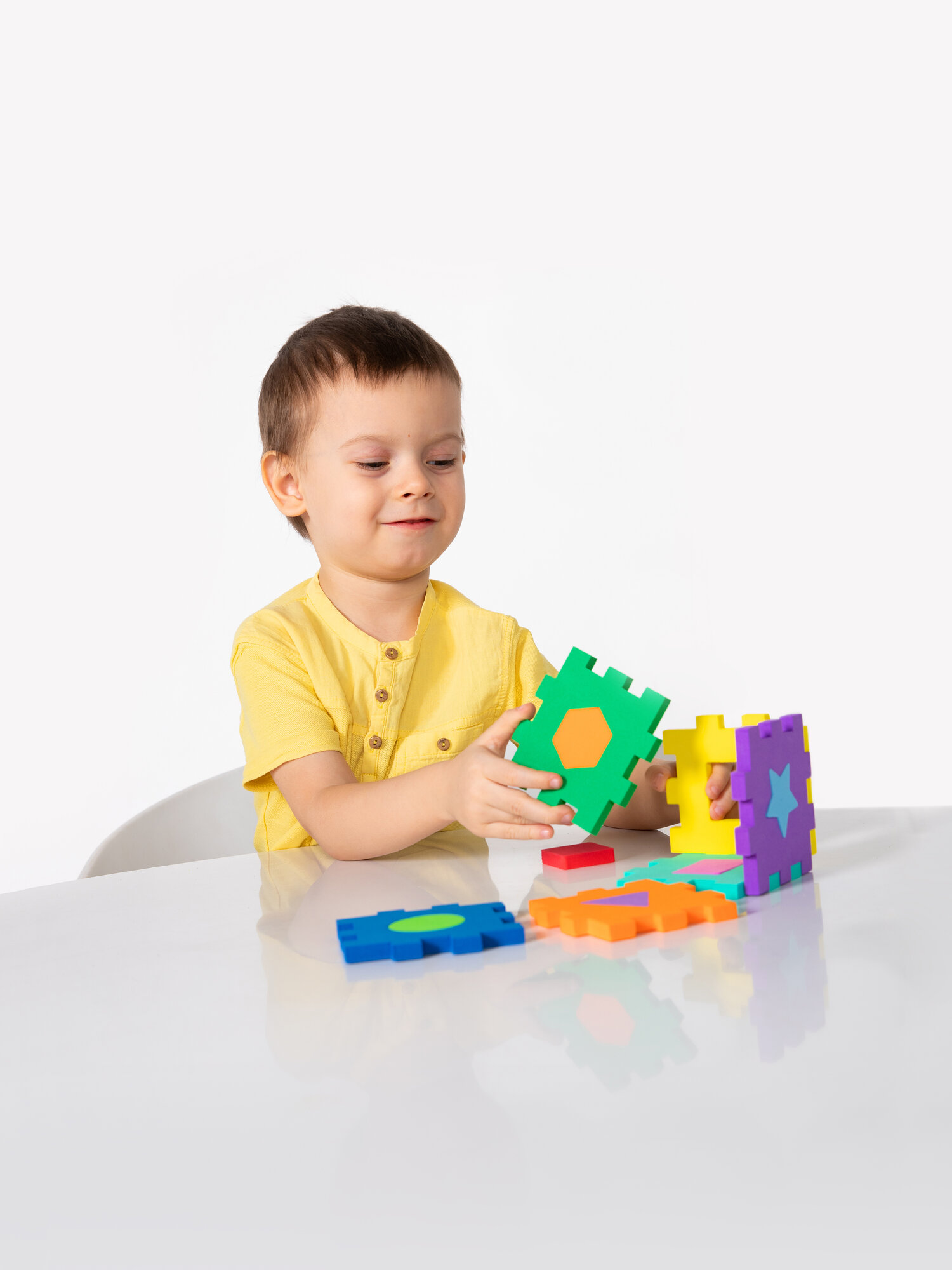 Мягкий кубик-сортер состоит из 6 граней с фигурными отверстиями, в которые малышу предлагается поместить подходящие по