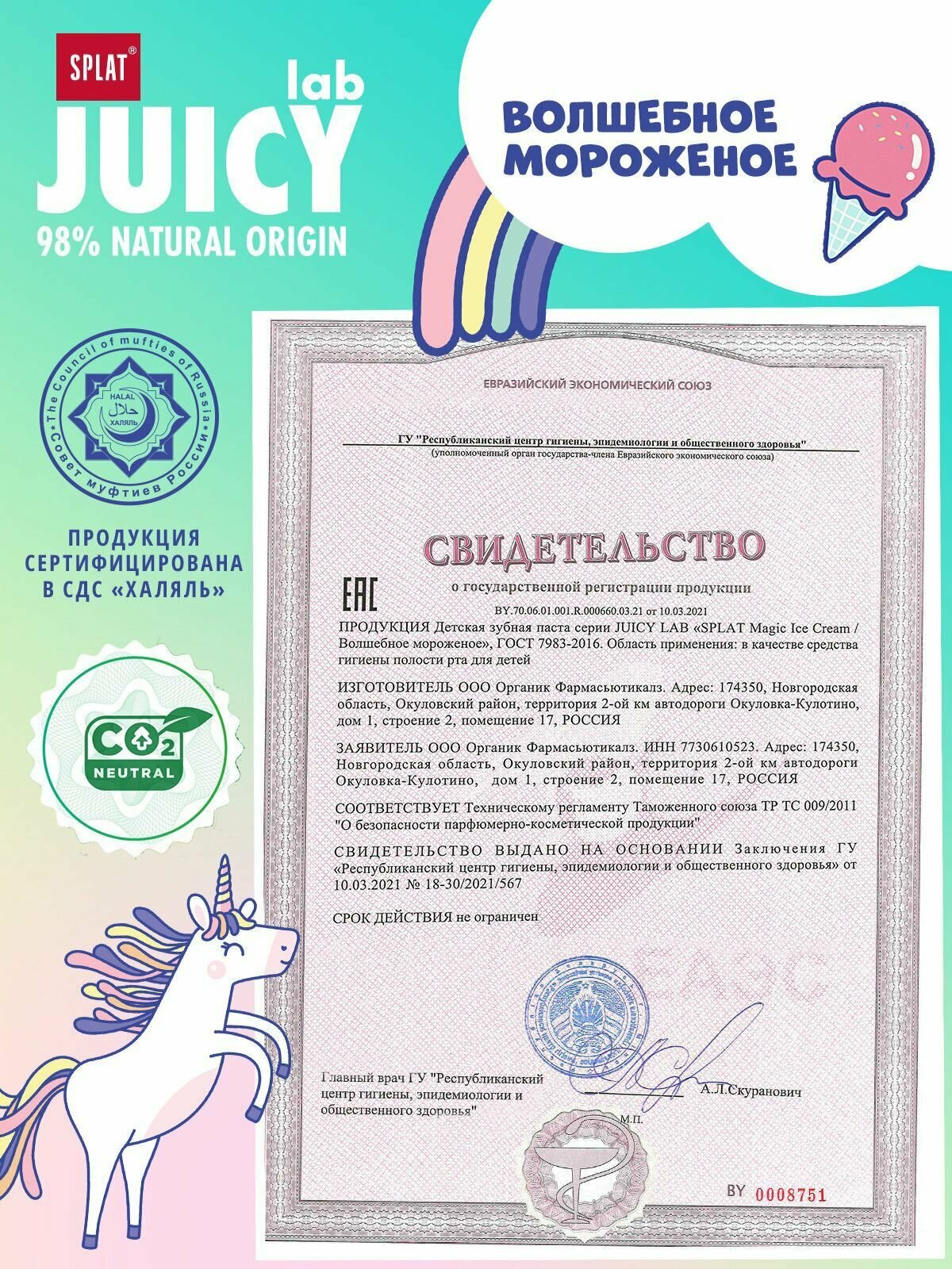 Паста зубная детская волшебное мороженое Juicy Lab Splat/Сплат 80г Органик фармасьютикалз ООО (2134480)