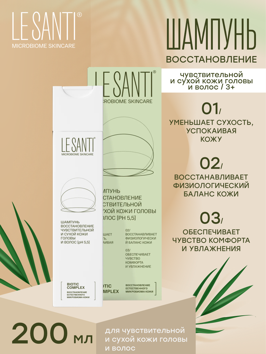Шампунь Le Santi для чувствительной, сухой и очень сухой кожи, в том числе склонной к атопии. Для взрослых и детей с 3 лет. Мягко и бережно очищает волосы, делая их сияющими и мягкими. Имеет нейтральный pH 5,5, поддерживает физиологический баланс кожи головы. Фракции пробиотика lactobacillus plantarum способствуют пробуждению естественных механизмов защиты кожи, обеспечивают увлажнение, снижение чувствительности и усиливают барьерные функции. Пребиотический комплекс создает условия для развития собственной полезной микрофлоры. Увлажняет и питает волосяные стержни, обеспечивая чувство комфорта. Пантенол обладает регенерирующим и смягчающим действием, питает кожу, быстро снимает раздражение, увеличивает прочность коллагеновых волокон. Масло персика стимулирует и питает волосяные фолликулы, за счет чего улучшает кровообращение и ускоряет регенерацию здоровых клеток. Молочная кислота, ксилит и сорбитол препятствуют потере влаги, увлажняет и регулирует pH. Не содержит SLS, SLES, парабенов, красителей и этилового спирта.Способ применения: вспенить немного шампуня в руках и нанести на кожу головы массажными движениями. Смыть. При необходимости повторить.