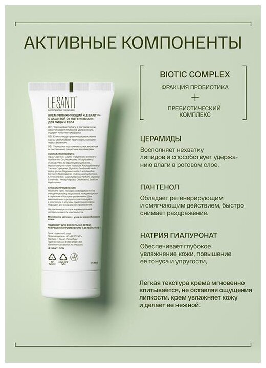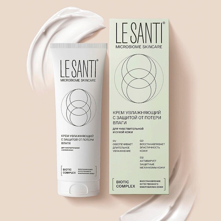 Крем Le Santi для лица и тела глубоко увлажняет сухую и чувствительную кожу и препятствует потере влаги. Фракции пробиотика Lactobacillus plantarum способствуют пробуждению естественных механизмов защиты кожи, обеспечивают увлажнение, снижение чувствительности и усиливают барьерные функции. Пребиотический комплекс создает условия для развития собственной полезной микрофлоры, что важно для поддержания здоровья кожи и ее иммунитета. Церамиды восполняют нехватку липидов и способствуют удержанию влаги в роговом слое. Пантенол обладает регенерирующим и смягчающим действием, питает кожу, быстро снимает раздражение, увеличивает прочность коллагеновых волокон. Повышает тонус и упругость. Равномерно распределяется и быстро впитывается, не оставляет липкой пленки.Способ применения: нанести немного средства на чистую сухую кожу лица, шеи и зоны декольте массажными движениями. Использовать утром и вечером.