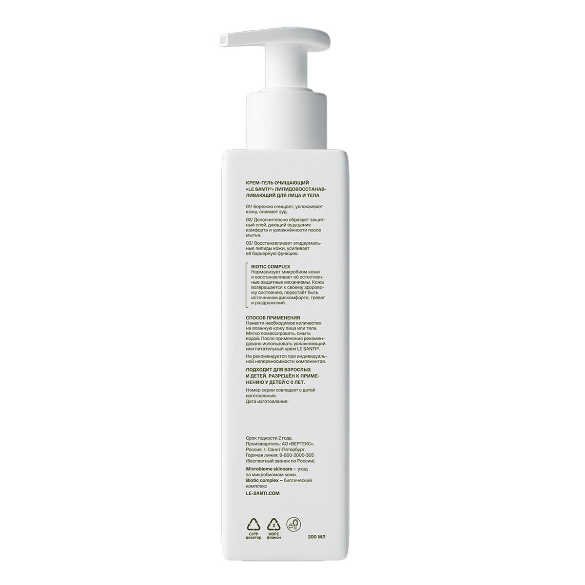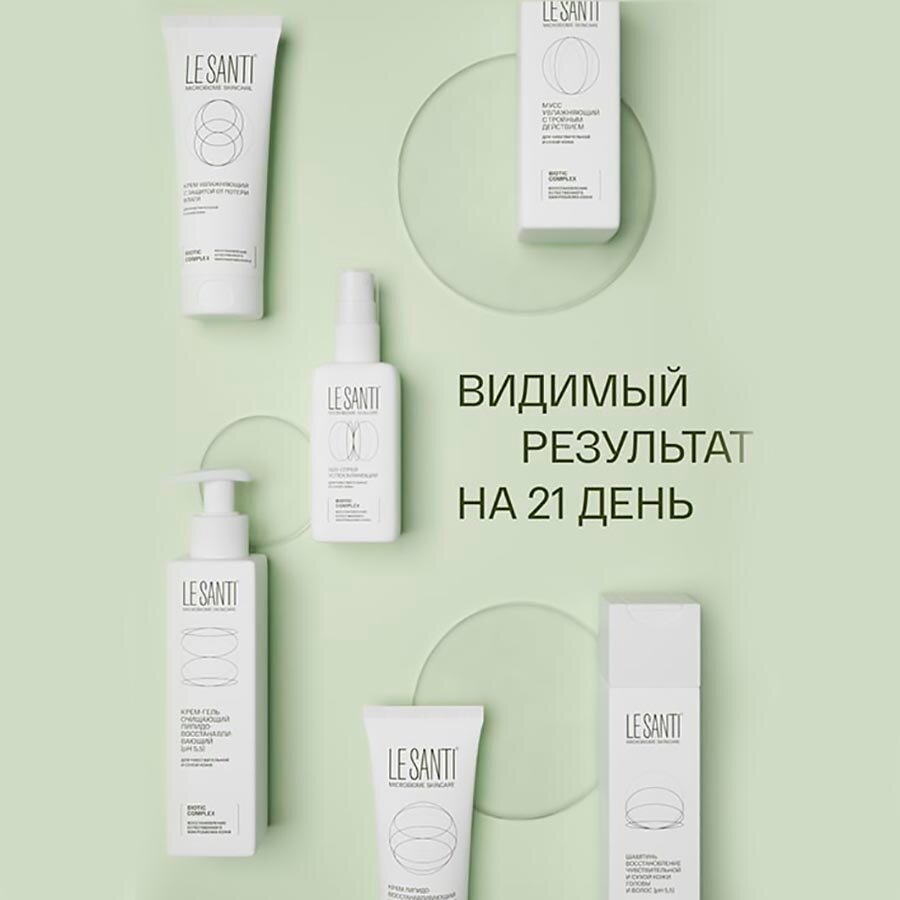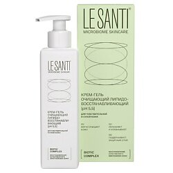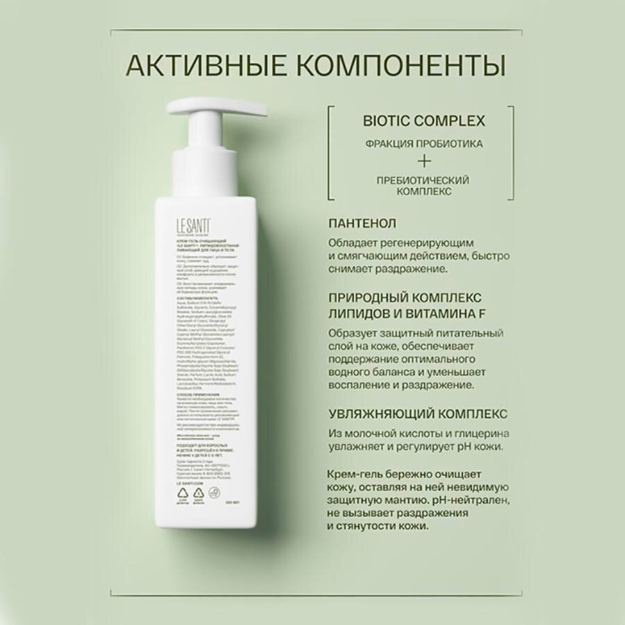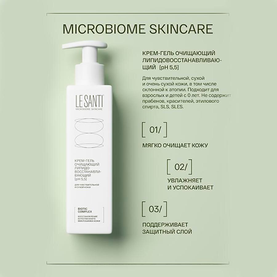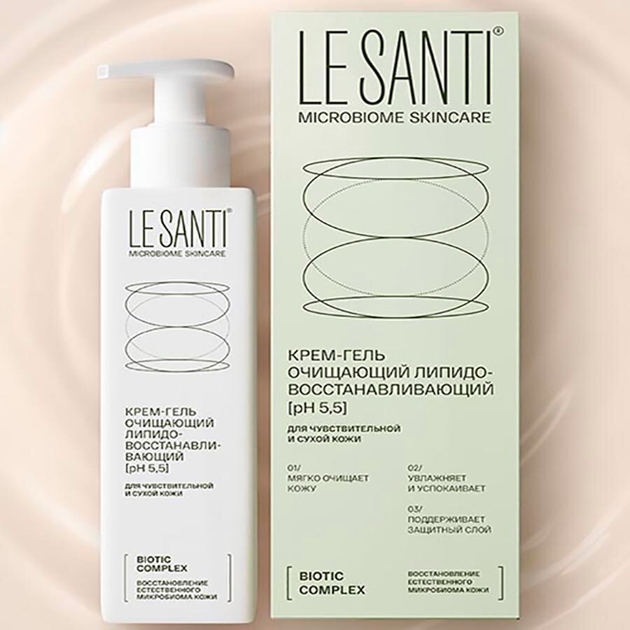 LE SANTI крем-гель очищающий липидовосстанавливающий для лица И тела - для чувствительной, сухой и очень сухой кожи лица и тела, в том числе склонной к атопии.Возраст: для взрослых и детей с 0 лет.Внешний вид и свойства: крем-гель белого цвета с легким приятным запахом.Крем-гель бережно очищает кожу, оставляя на ней невидимую защитную мантию. pH-нейтрален 5,5, не вызывает раздражения и стянутости кожи.Активная система ухода LE SANTI MICROBIOME SKINCARE содержит эффективный BIOTIC COMPLEX, направленный на нормализацию микробиома и восстановление естественных защитных механизмов кожи. Кожа возвращается к своему здоровому состоянию, перестает быть источником дискомфорта, тревог и раздражений:фракции пробиотика Lactobacillus plantarum способствуют пробуждению естественных механизмов защиты кожи, обеспечивают увлажнение, снижение чувствительности и усиливают барьерные функции.пребиотический комплекс создаёт условия для развития собственной полезной микрофлоры, что важно для поддержания здоровья кожи и её иммунитета.активные компоненты:[BIOTIC COMPLEX: про- и пребиотики] - работает на уровне микробиома.пантенол - обладает регенерирующим и смягчающим действием, питает кожу, быстро снимает раздражение, увеличивает прочность коллагеновых волокон.природный комплекс липидов И витамина F - образует защитный питательный слой на коже, обеспечивает поддержание оптимального водного баланса и уменьшает воспаление и раздражение.увлажняющий комплекс - из молочной кислоты и глицерина увлажняет и регулирует pH кожи.Специальные особенности: не содержит SLS, SLES, парабенов, красителей и этилового спиртаРезультат:01/ Бережно очищает, успокаивает кожу, снимает зуд.02/ Дополнительно образует защитный слой, дающий ощущение комфорта и увлажненности после мытья.03/ Восстанавливает эпидермальные липиды кожи, усиливает ее барьерную функцию.видимый результат на 21 день применения.ПоказанияВ качестве деликатного очищающего средства для чувствительной, сухой и очень сухой кожи, в том числе склонной к атопии. Подходит для взрослых и детей. Разрешён к применению у детей с 0 лет.