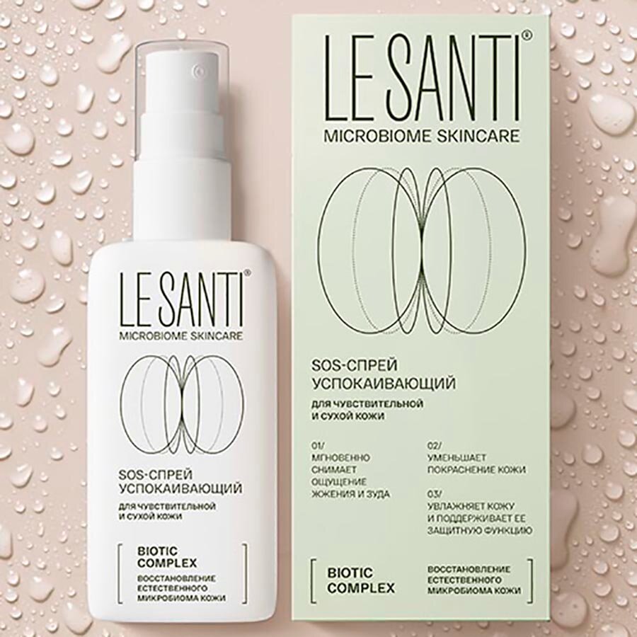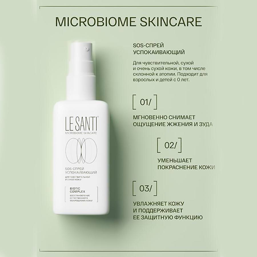Активная система ухода LE SANTI MICROBIOME SKINCARE содержит эффективный BIOTIC COMPLEX, направленный на нормализацию микробиома и восстановление естественных защитных механизмов кожи. Кожа возвращается к своему здоровому состоянию, перестает быть источником дискомфорта, тревог и раздражений: фракции пробиотика Lactobacillus plantarum способствуют пробуждению естественных механизмов защиты кожи, обеспечивают увлажнение, снижение чувствительности и усиливают барьерные функции. Пребиотический комплекс создаёт условия для развития собственной полезной микрофлоры, что важно для поддержания здоровья кожи и её иммунитета. 01/ Интенсивно увлажняет кожу, насыщая ее влагой и необходимыми для восстановления структуры эпидермиса жирными кислотами, витаминами Е, В5.02/ Значительно уменьшает сухость, проявления воспалений и шелушений, сглаживает микрорельеф.03/ Благодаря воздушной текстуре быстро впитывается, обеспечивая длительное чувство комфорта.
