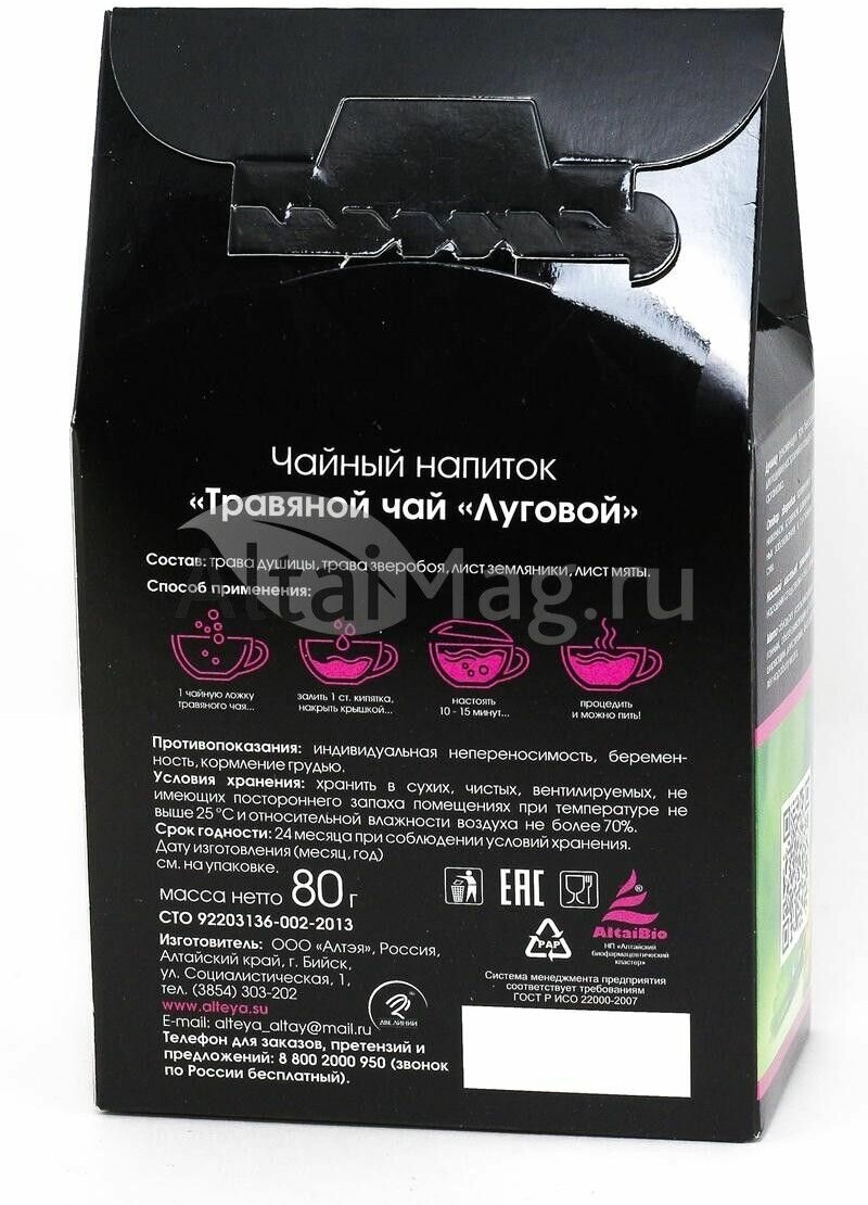 Травяные чаи "Алтэя" обладают приятным вкусом и ароматом, а правильно подобранное сочетание трав наделяют напиток целебными свойствами. Традиционно считается, что травы, входящие в состав травяного чая «Луговой», обладают полезными свойствами.